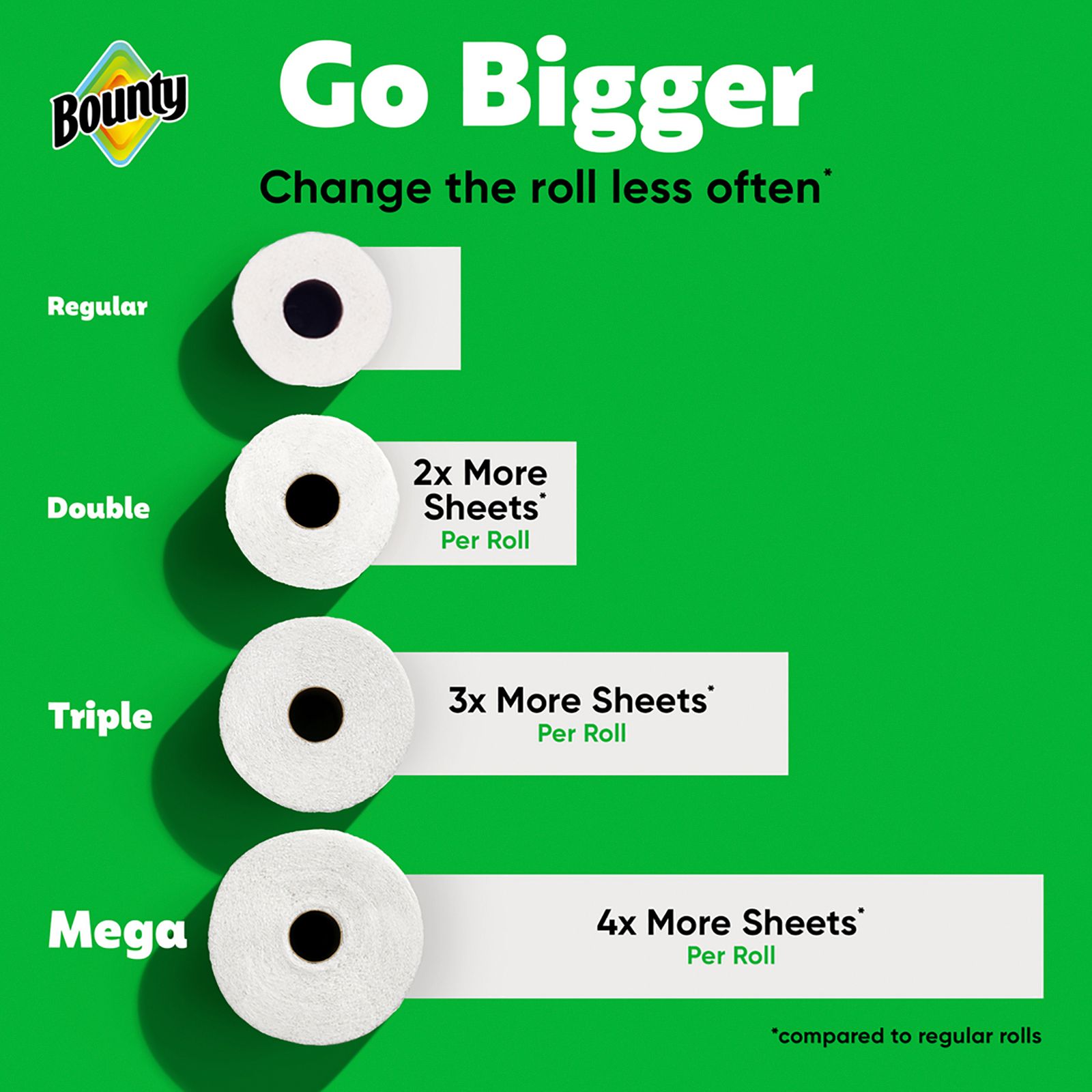 Bounty Paper Towels are 2x more absorbent, so you can clean up messes quicker and use less than the leading ordinary brand. Each sheet has a Durable Diamond Texture to tackle anything from everyday spills to tough projects throughout your home. A variety of pack and rolls sizes are available, and going bigger means you change the roll less often* to always have Bounty on hand. That's right, our Bounty Mega Roll equals 4 rolls in one**, so you'll be running back to the store less and less. Buy in bulk. Choose from different sheet sizes based on what works best for your needs, including Select-A-Size and Full-Size. You can also change it up with our printed designs. *vs Bounty Regular Roll **compared to Regular Rolls.