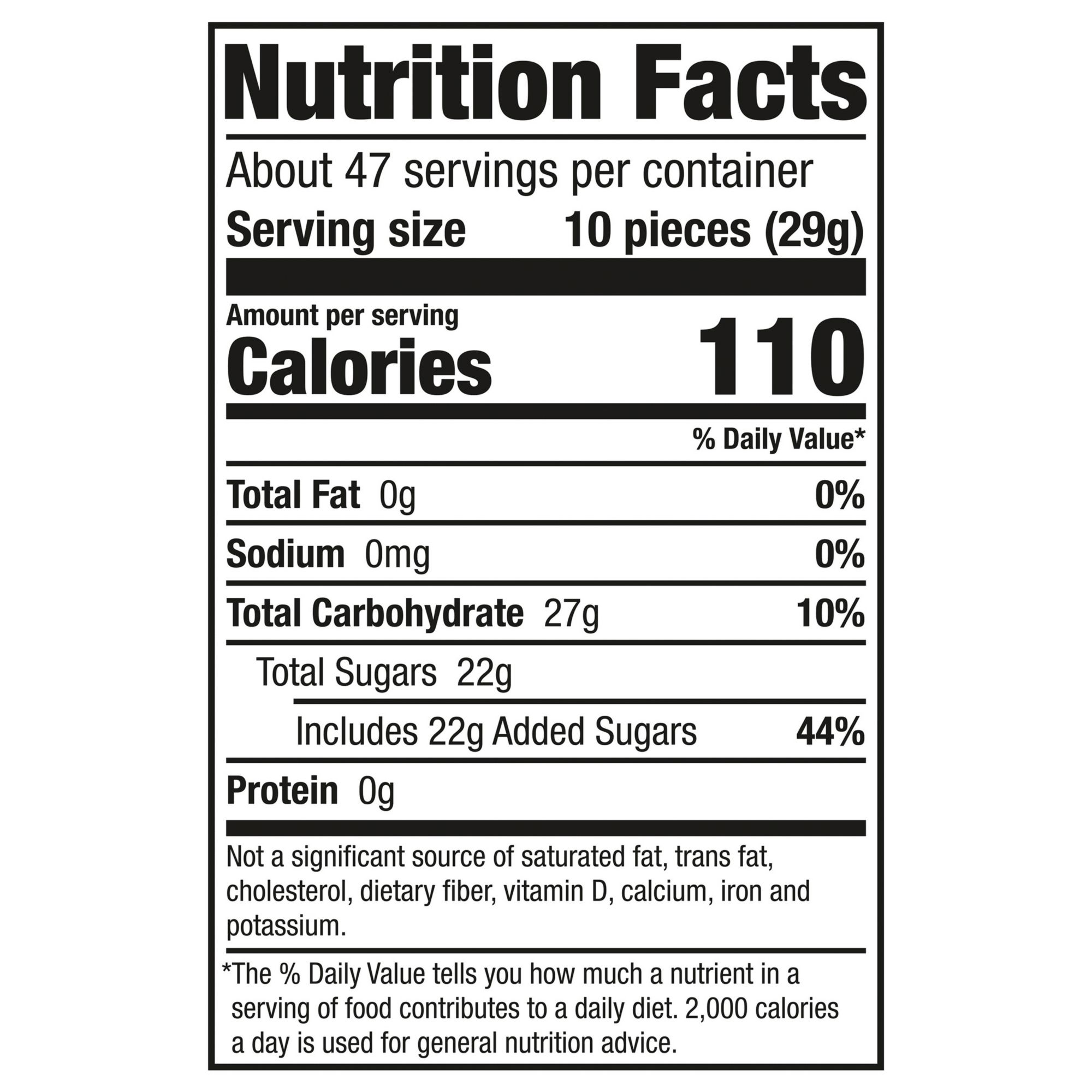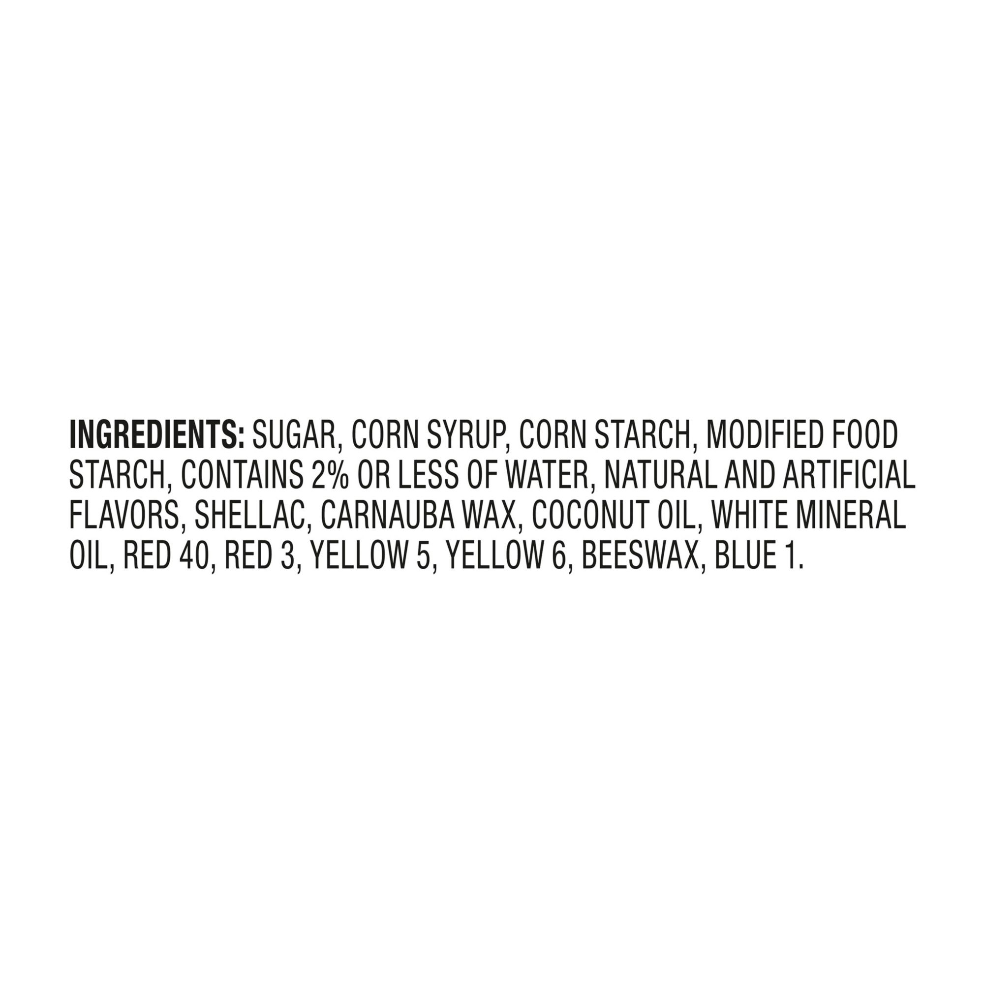 Ingredients: Sugar, Corn Syrup, Corn Starch, Modified Corn Starch, Natural and Artificial Flavors, Coconut Oil, Red 40, Yellow 5, Blue 1, Yellow 6 Red 3, Beeswax.