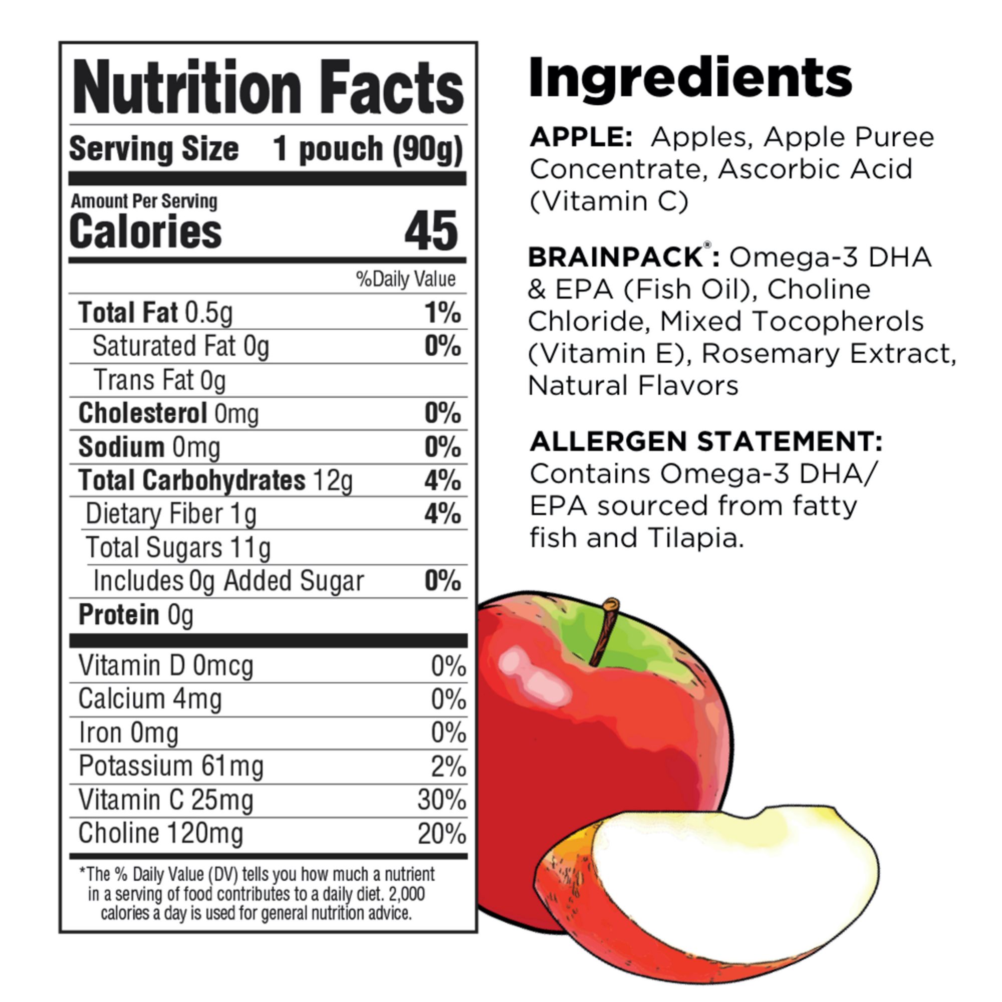 Ingredients:Apple Puree, Apple Puree Concentrate, Ascorbic Acid (Vitamin C) BrainPack: Omega-3 DHA & EPA (fish-oil), Choline Chloride, Mixed Tocopherols (Vitamin E), Rosemary Extract, Natural Flavors