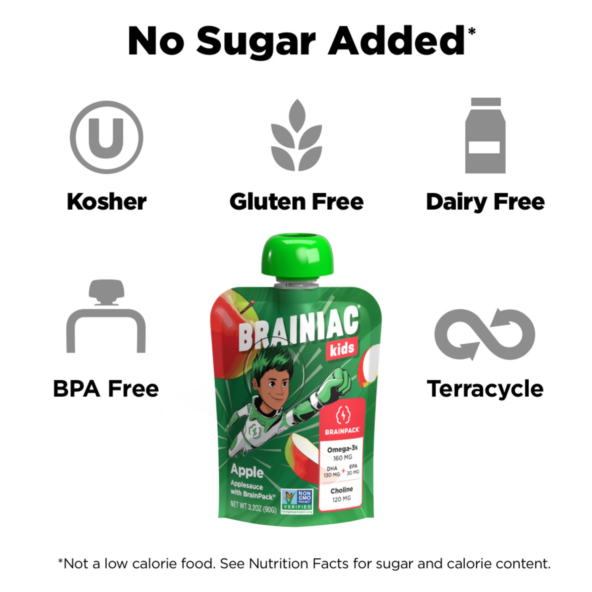 A smarter snack created by 2 dads, plus a team of expert pediatricians, neurologists and nutritionists. Each applesauce squeeze pouch is bursting with apple yumminess and packed with the brain nutrients growing minds need and often don’t get from their meals. These nutrients include Omega-3 DHA, EPA and Choline, the nutrients found in foods like salmon and broccoli, the most common ‘push aside’ foods. As a result, most kids are only getting 20% of their daily Omega-3s, but with a Brainiac Kids pouch, they’ll get as much as 90%+ of their recommended daily intake of Omega-3 DHA/EPA. And if that wasn't enough, with 25mg of Vitamin C in each pouch, there is an extra immunity boost in every on-the-go snack. So while your kids are asking for their new five snack, you can relish in a little parenting win for the day!