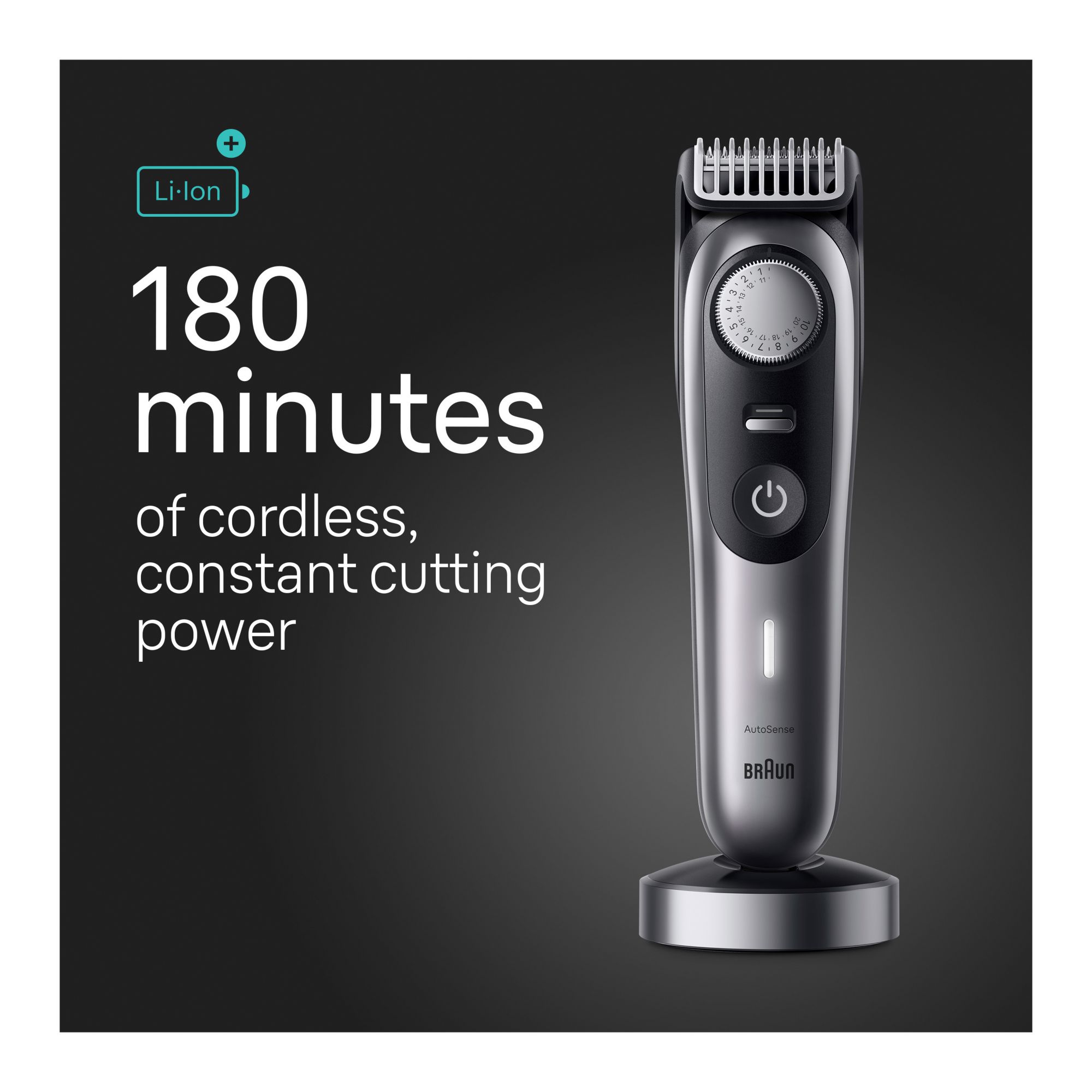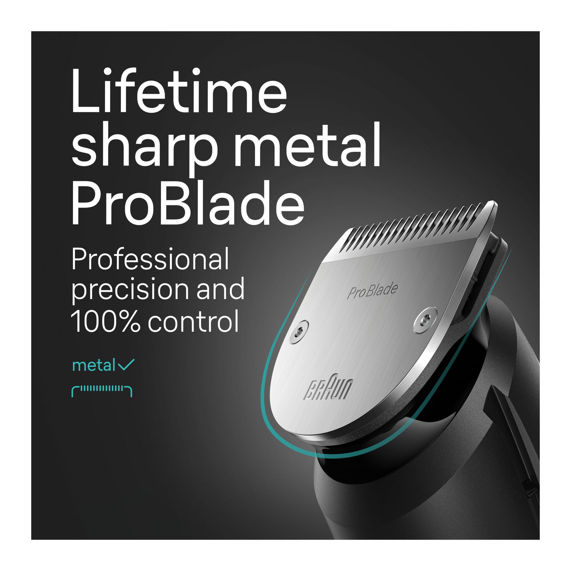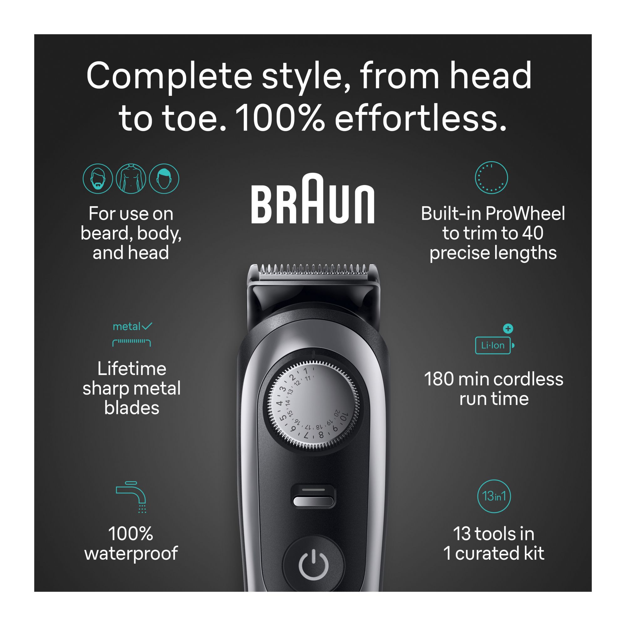 Braun Series 9 All-In-One is an 8-in-1 curated style kit for unlimited versatility and professional precision at home. The built in Precision Wheel features 40 different length cutting settings in 0.5 mm steps for maximum precision without the hassle of added attachments. This is coupled with the ProLock for no mistakes. The ProLock switches on or off to lock the ProWheel length selection into place for a clean, consistent shave every time. Braun's sharpest metal blade, the ProBlade, is efficient in every stroke, meaning less passes even in tricky areas for less skin irritation, a great finish and comfortable all-over body grooming. The Powerful Li-Ion battery has 180 minutes of cordless, constant cutting power. Braun's innovative AutoSense technology can be used on beard, body and hair grooming with incredible results on any hair type, length or thickness. The All-In-One Series 9 is built to last, in a metal lacquered housing designed for durability and a perfect fit in hand. The trimmer and attachments are 100% waterproof and shower proof with lifetime sharp metal blades, two year warranty, weighted charging stand and a travel case for storage. Includes: Trimmer device, ProContour trimmer head, sensitive body trimmer (fine pitch trimmer), precision adjustable beard (0.5 mm - 10 mm) comb, adjustable hair (10.5 - 20 mm) combs, ProDetail trimmer head, charging stand, and travel case.
