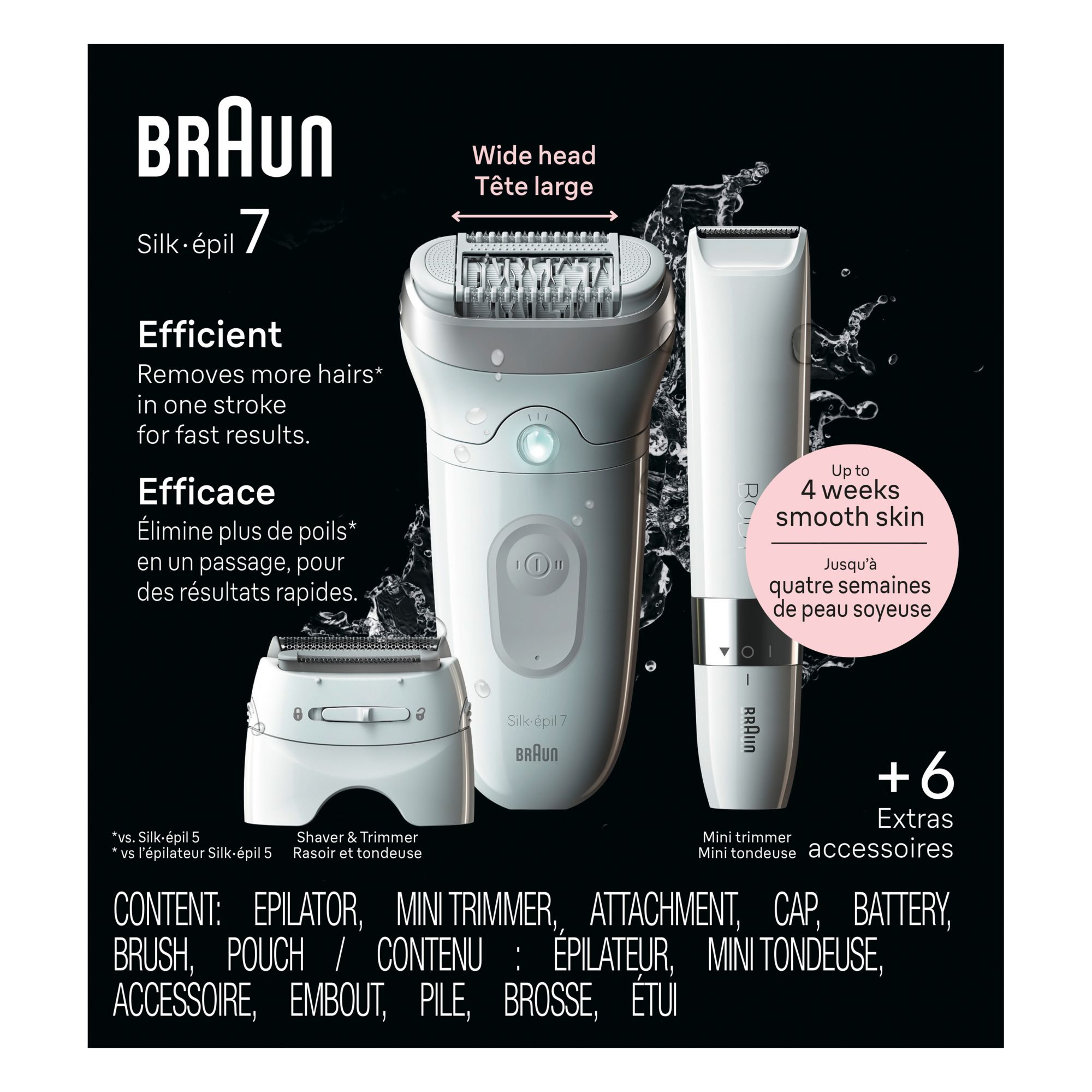Braun Silk-Epil 7 Epilator, Wet and Dry, Wide Head, Includes Body Trimmer, Shaver Head and Trimmer Comb