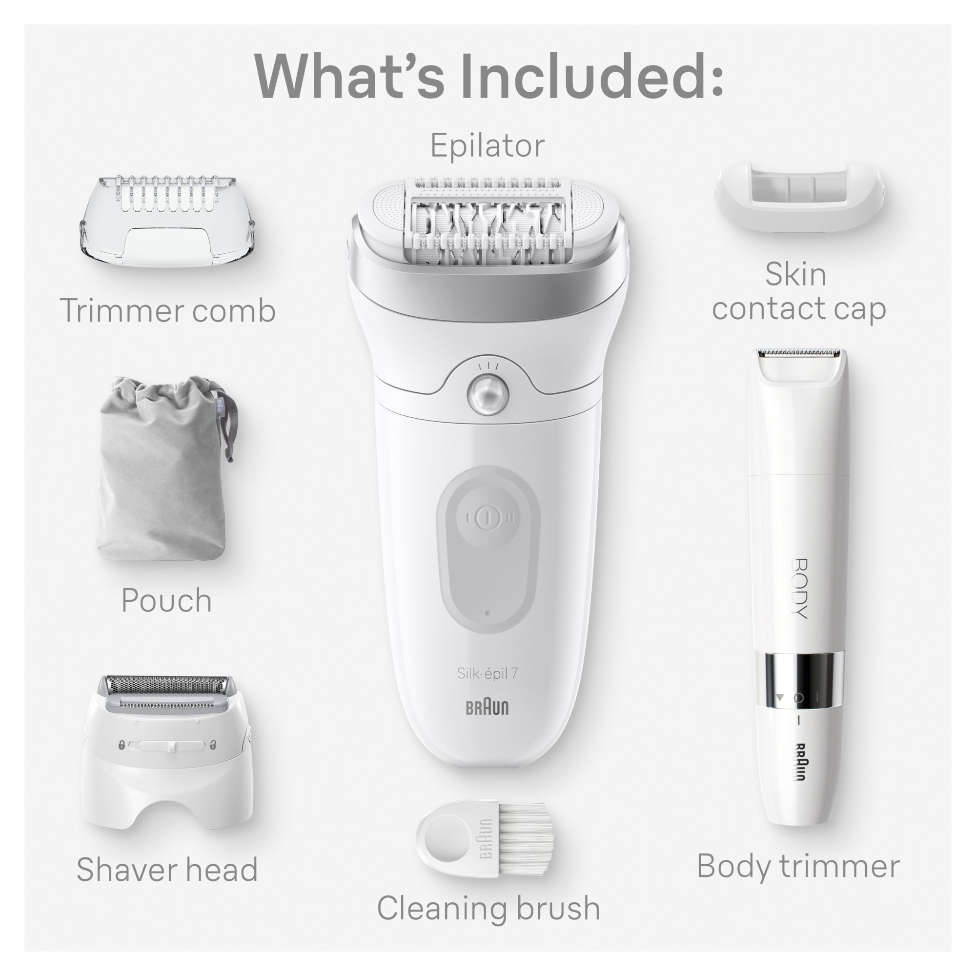 Includes: SE7 Epilator, Body trimmer, Trimmer comb, Shaver head, Skin Contact Cap, Cleaning Brush, and Pouch