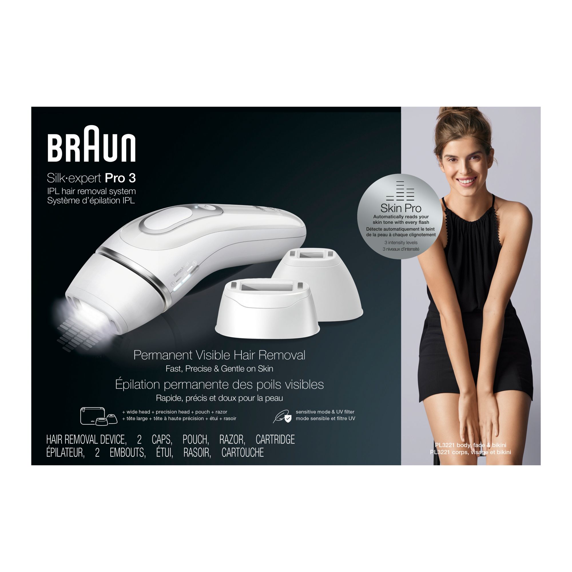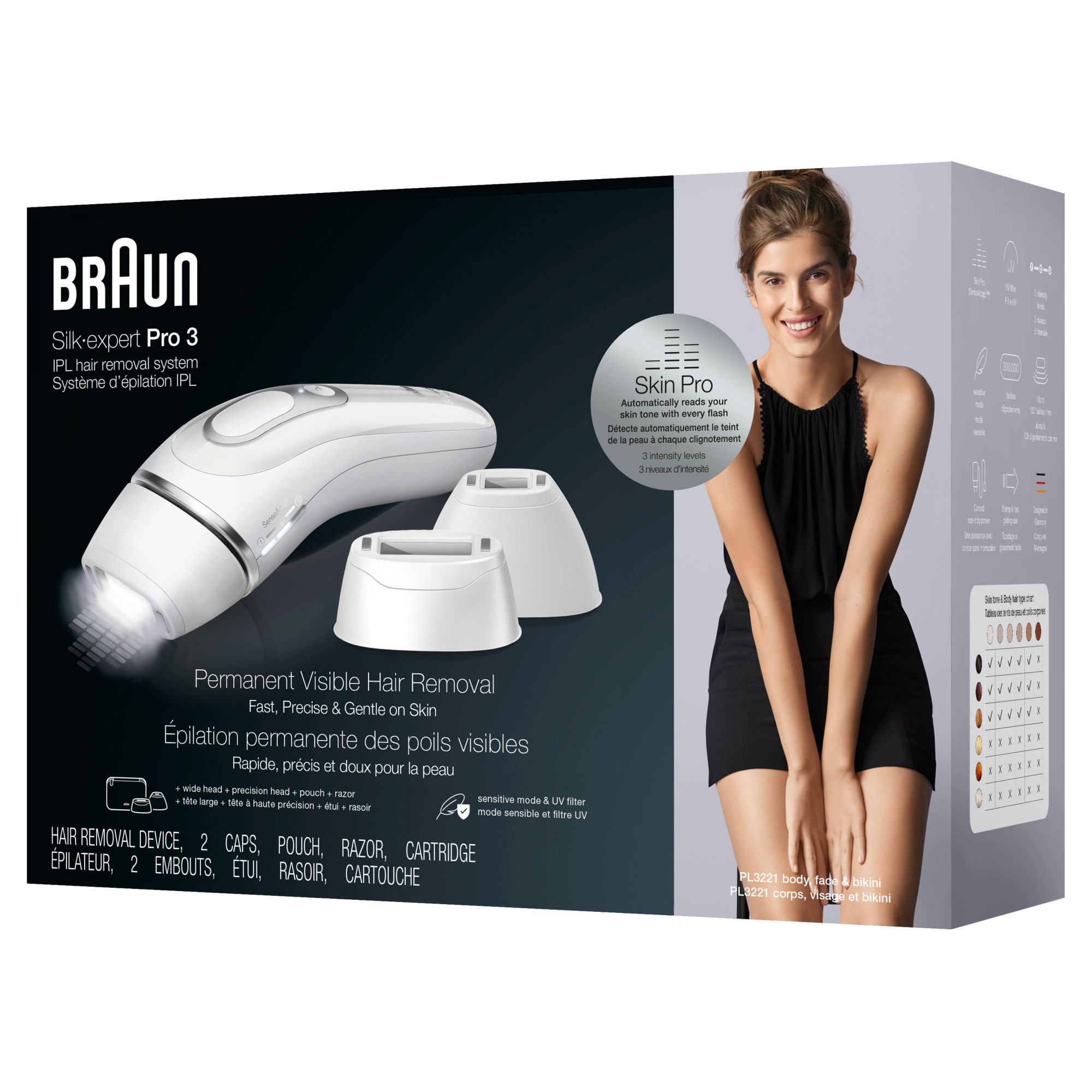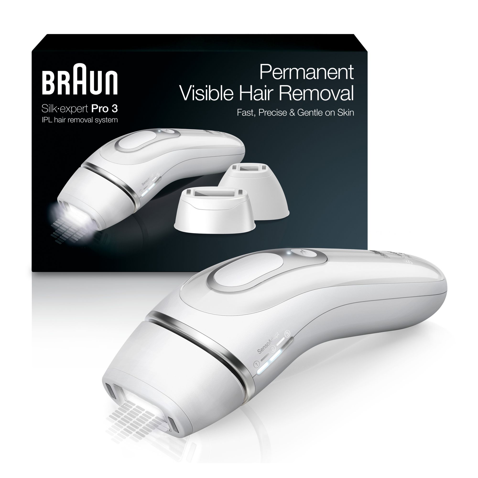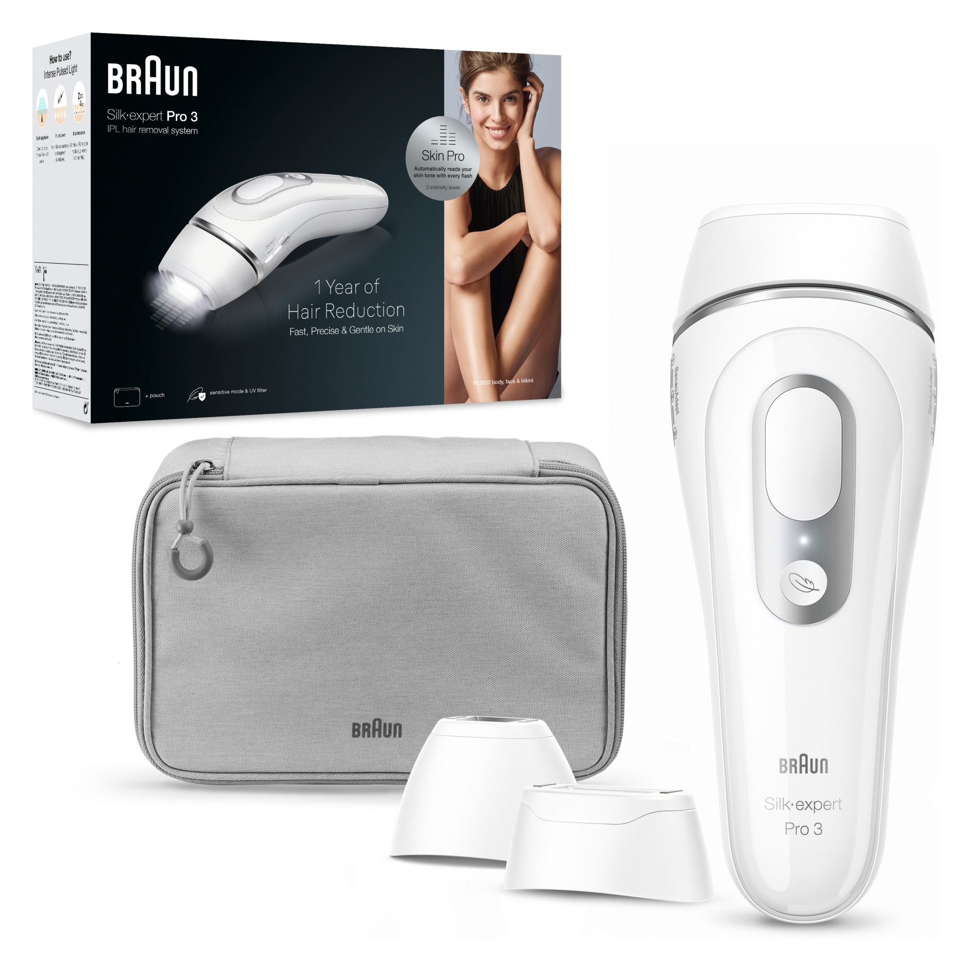 Silk·expert Pro 3 isn't a laser hair removal device but instead uses Braun's IPL technology. Get up to 3 months of smooth skin from home, and get visible hair reduction in just 3 months. The Skin pro technology automatically adapts to your skin tone, optimizing the power for the perfect balance between fast results and gentleness on skin. Two sensitive modes ensure your skin's comfort and up to 100 flashes per minute enables less missed spots when gliding on your skin.