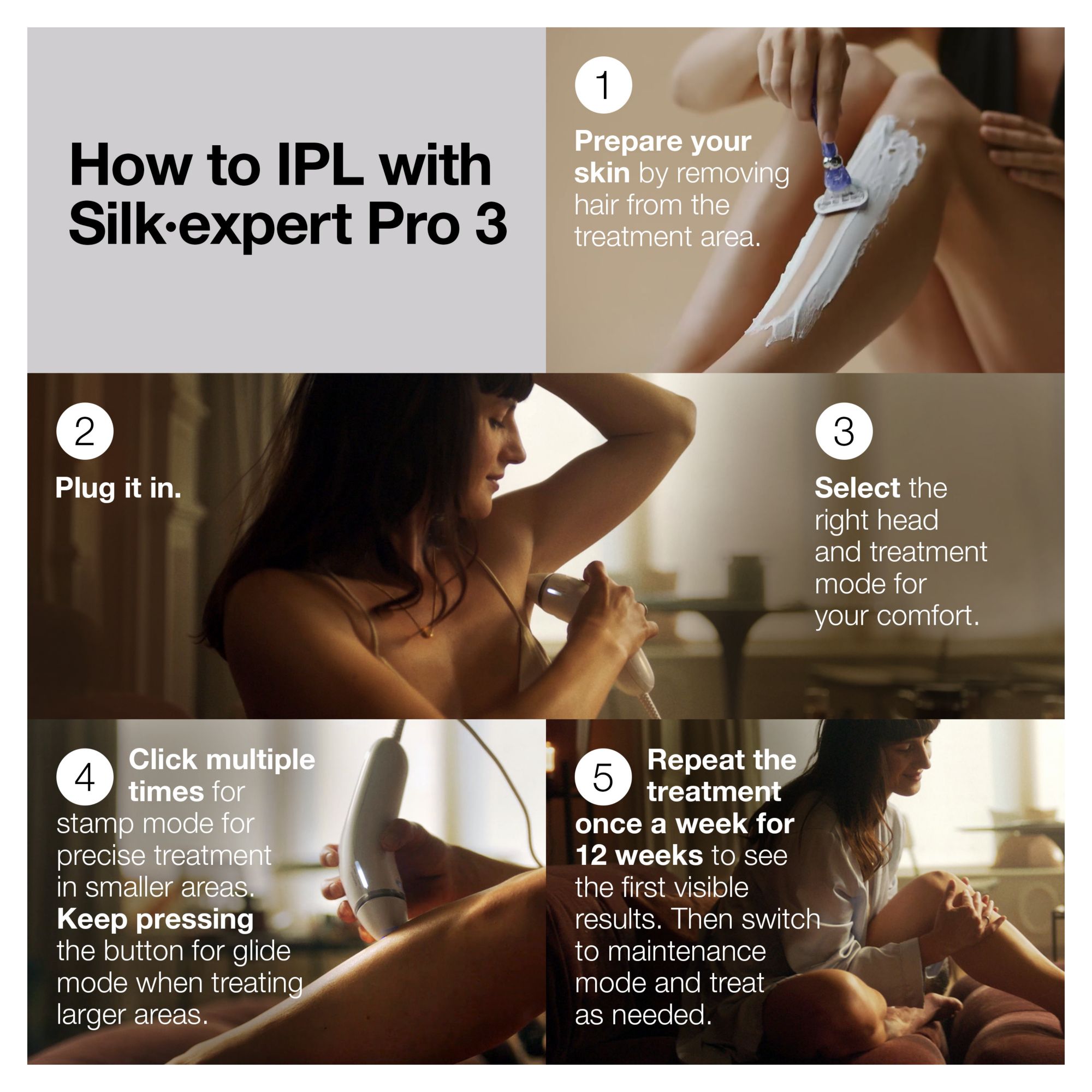 Product Warnings and Restrictions: DO NOT USE the device on any area where you may want hair to grow back. Hair removal by lasers or intense pulse light sources can cause increased hair growth in some individuals. Based upon currently available data, the highest risk groups for this response are females of Mediterranean, Middle Eastern, and South Asian heritage treated on the face and neck. DO NOT use if you have a known sensitivity to sunlight (photosensitivity) or are taking a medication that causes photosensitivity e.g., certain antibiotics such as tetracycline, NSAIDS such as ibuprofen or retinoids such as Accutane and/or topical retinoids such as Retin A. Always check the instructions that come with your medical products to see if photosensitivity is listed as a side effect. Using the Silk·expert device on photosensitive skin could result in skin damage including blisters and swelling. RISKS OF USING THE SILK·EXPERT: The side effects reported in the clinical trial were: Itchiness - Four subjects experienced mild itchiness after treatment. Slight Redness - This was reported by 1 subject. Mild Stinging Sensation - Five subjects reported mild discomfort following treatment. In-growing Hair - One subject reported experiencing an in-growing hair following treatment. Follicle Redness - One subject reported a red spot at the treatment site following treatment. In all cases, the treated skin returned to normal within 7 days. CONTRAINDICATIONS: DO NOT use the device if you have very dark skin. DO NOT use the device if your skin has been artificially or naturally tanned or is burned from sun overexposure. DO NOT expose treated areas to the sun. Wait at least 7 days after treatment before exposing treated skin to direct sunlight. DO NOT use the device directly on the nipples, genitals or around the anus. DO NOT use the device if you have a history of skin cancer or pre-cancerous lesions. DO NOT use if you are pregnant, lactating. DO NOT use on dark brown or black spots such as birthmarks, moles or warts. DO NOT use if you have any skin condition in the treatment area, including psoriasis, vitiligo, eczema, acne, herpes simplex or active infections or wounds. DO NOT use if you are under the age of 18. DO NOT use on tattoo or permanent make-up in the treatment area. DO NOT use on beard/facial hair for men. The Silk·expert is an electrical device that emits intense pulses of light. Read the User Guide fully before using the Silk·expert. DO NOT look directly into the treatment window. BENEFITS OF USING THE SILK·EXPERT: The Silk·expert has been tested in a clinical trial on 33 subjects who received 12 weekly treatments. The clinical trial participants showed on average 44% less hair 6 months after their last treatment and 36% less hair 12 months after their last treatment. Actual results did vary from person to person