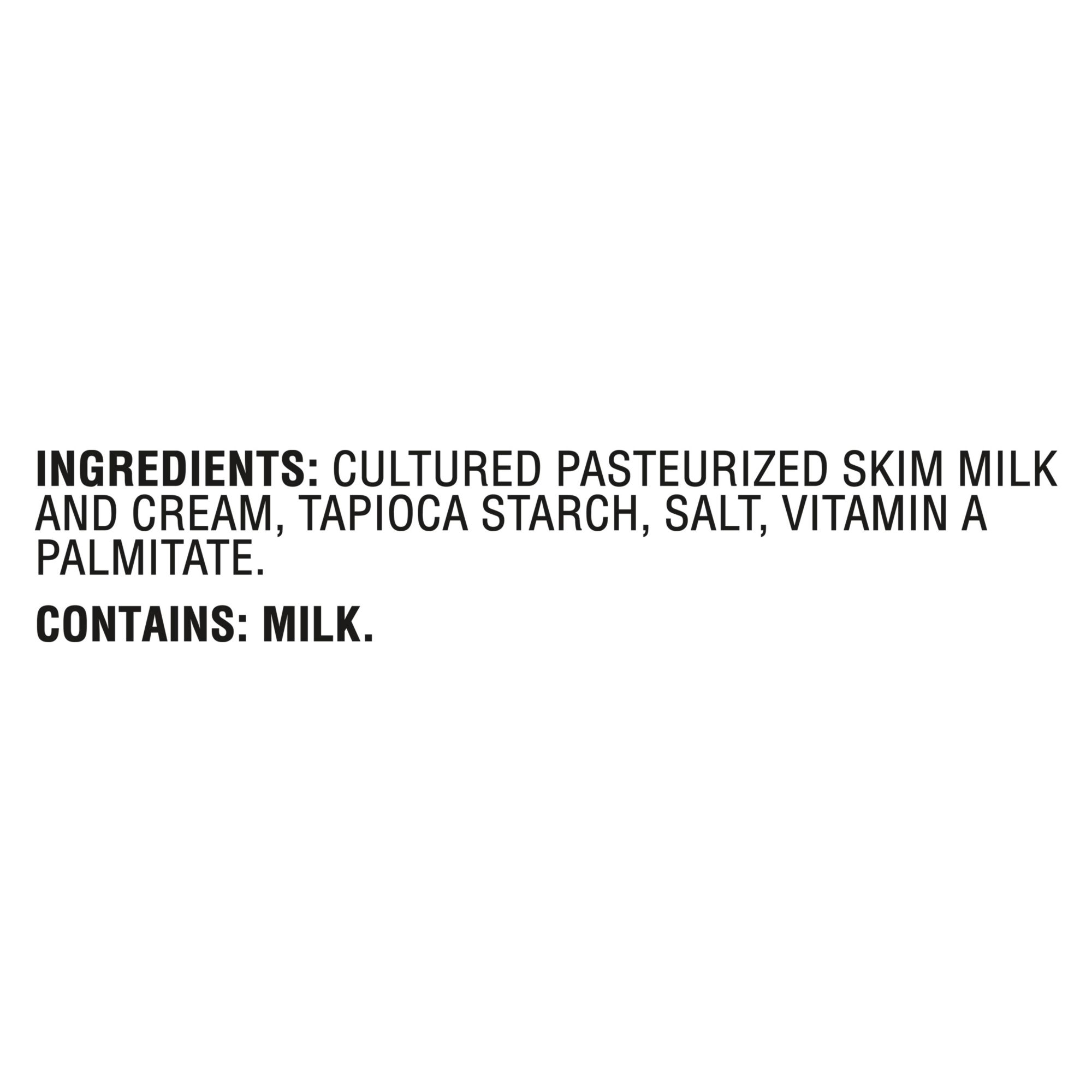 Ingredients: Cultured Pasteurized Skim Milk And Cream, Tapioca Starch, Salt, Vitamin A Palmitate.