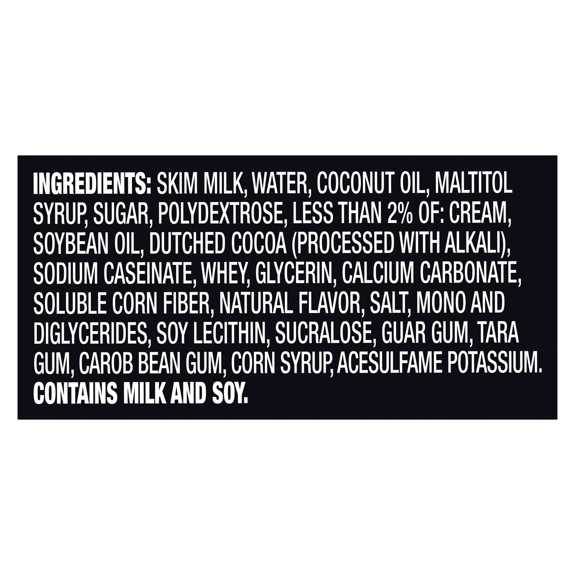Ingredients: Skim Milk, Water, Coconut Oil, Maltitol Syrup, Sugar, Polydextrose, Less Than 2% Of: Cream, Soybean Oil, Dutched Coca (Processed With Alkali), Sodium Caseinate, Whey, Glycerin, Calcium Carbonate, Soluble Corn Fiber, Natural Flavor, Salt, Mono And Diglycerides, Soy Lecithin, Sucralose, Guar Gum, Tara Gum, Carob Bean Gum, Corn Syrup, Acesulfame Potassium. Contains Milk And Soy