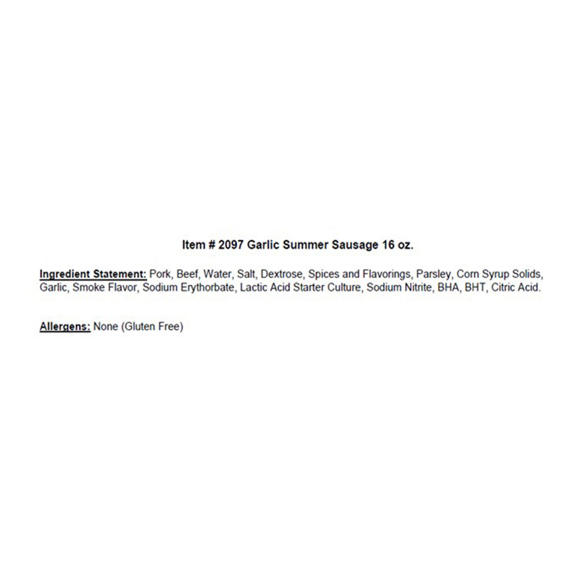 Ingredients Pork, Beef, water, Salt, Dextrose, Spices and Flavorings, Parsley, Corn Syrup Solids, Garlic, Smoke Flavor, Sodium Erythorbate, Lactic Acid Starter Culture, Sodium Nitrite, BHA, BHT, Citric Acid.