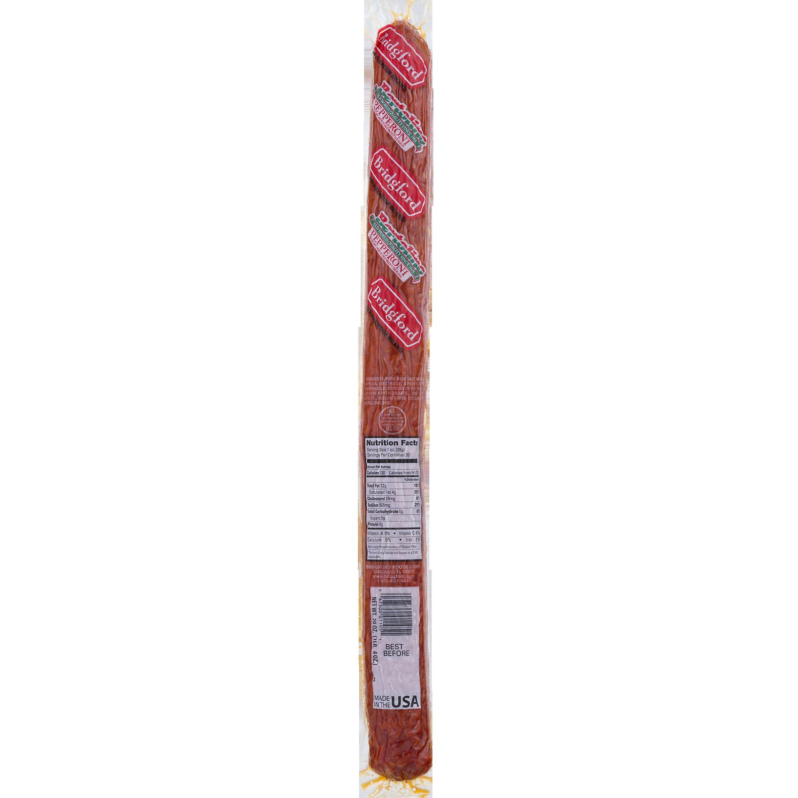 Soft and smoky, this Bridgford 20 Oz. Pepperoni Stick captures an old-world quality that's been enjoyed since 1893. The delicious flavor comes from natural fermentation and aging processes in a state-of-the-art food processing facility. Eat it with crackers and cheese or use it to top off your pizza or salad.