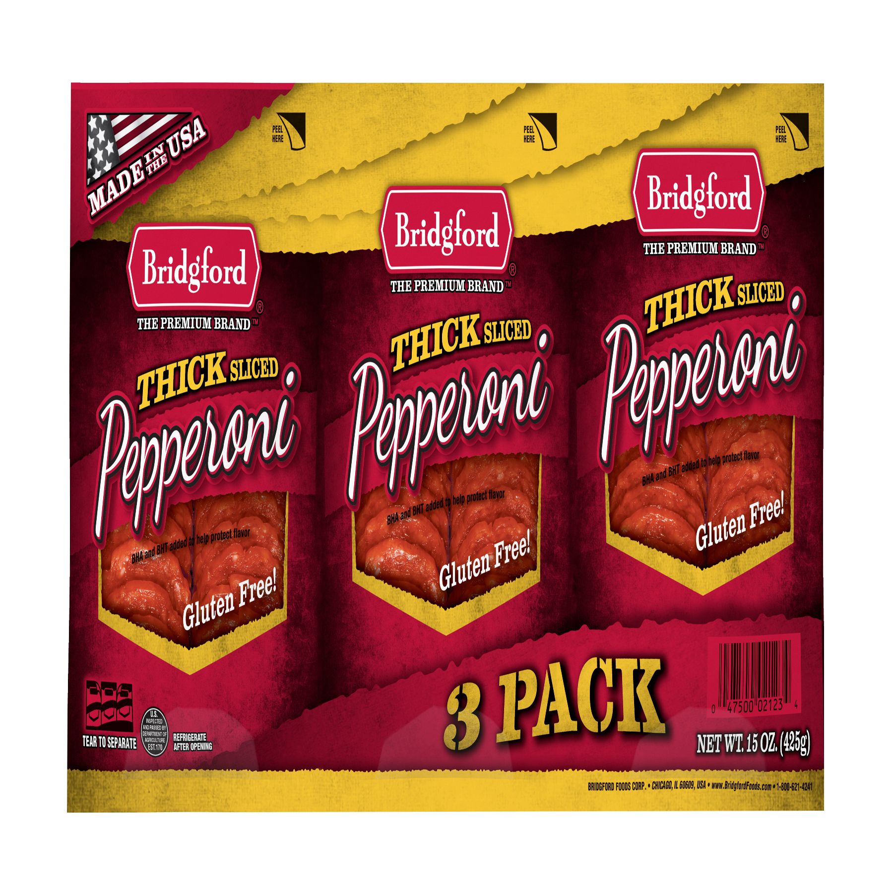 Bridgford Thick Cut Sliced Pepperoni is a premium thick cut sliced pepperoni in a convenient three-pack pouch. Serves up to 8 people. Made from pork, beef, spices and flavorings.