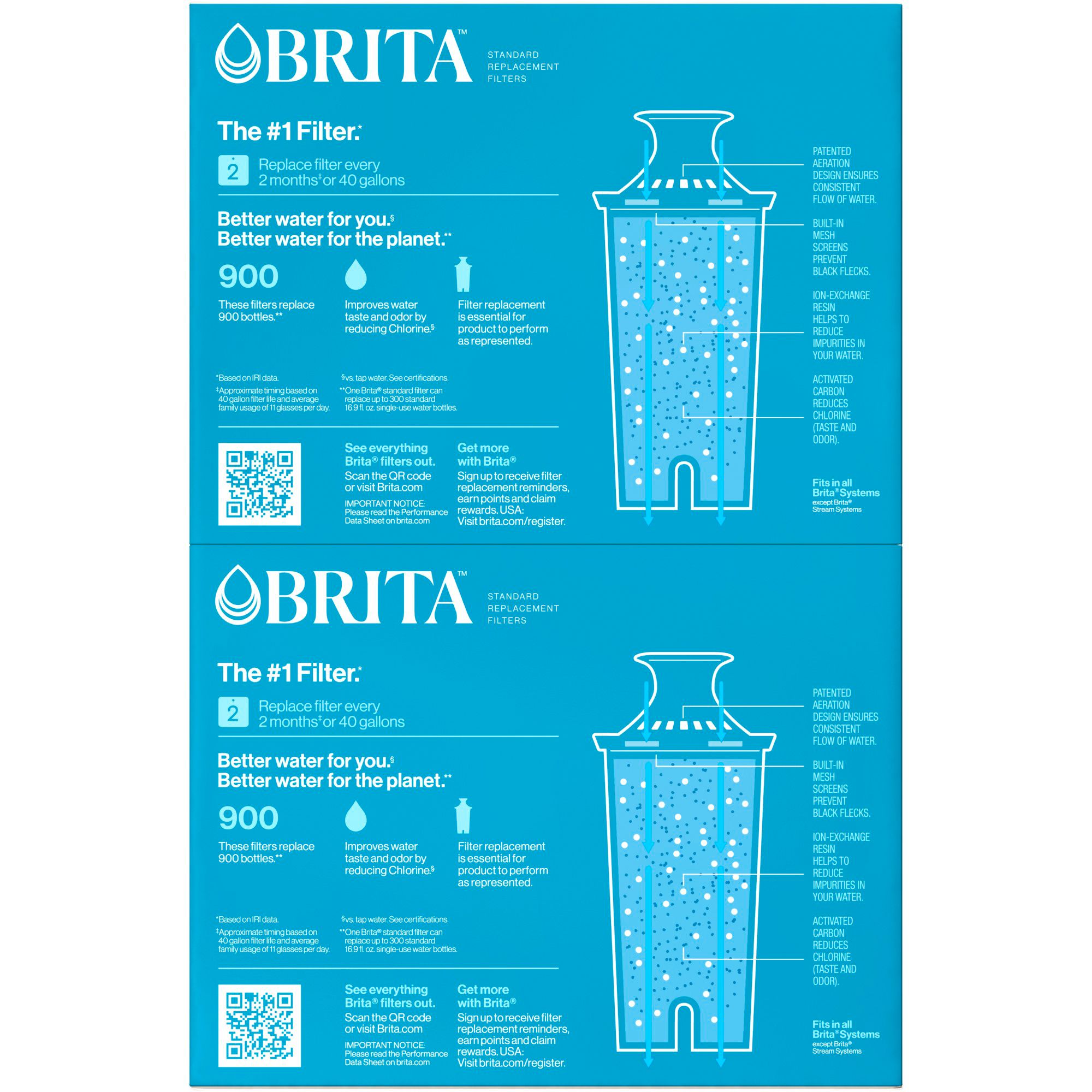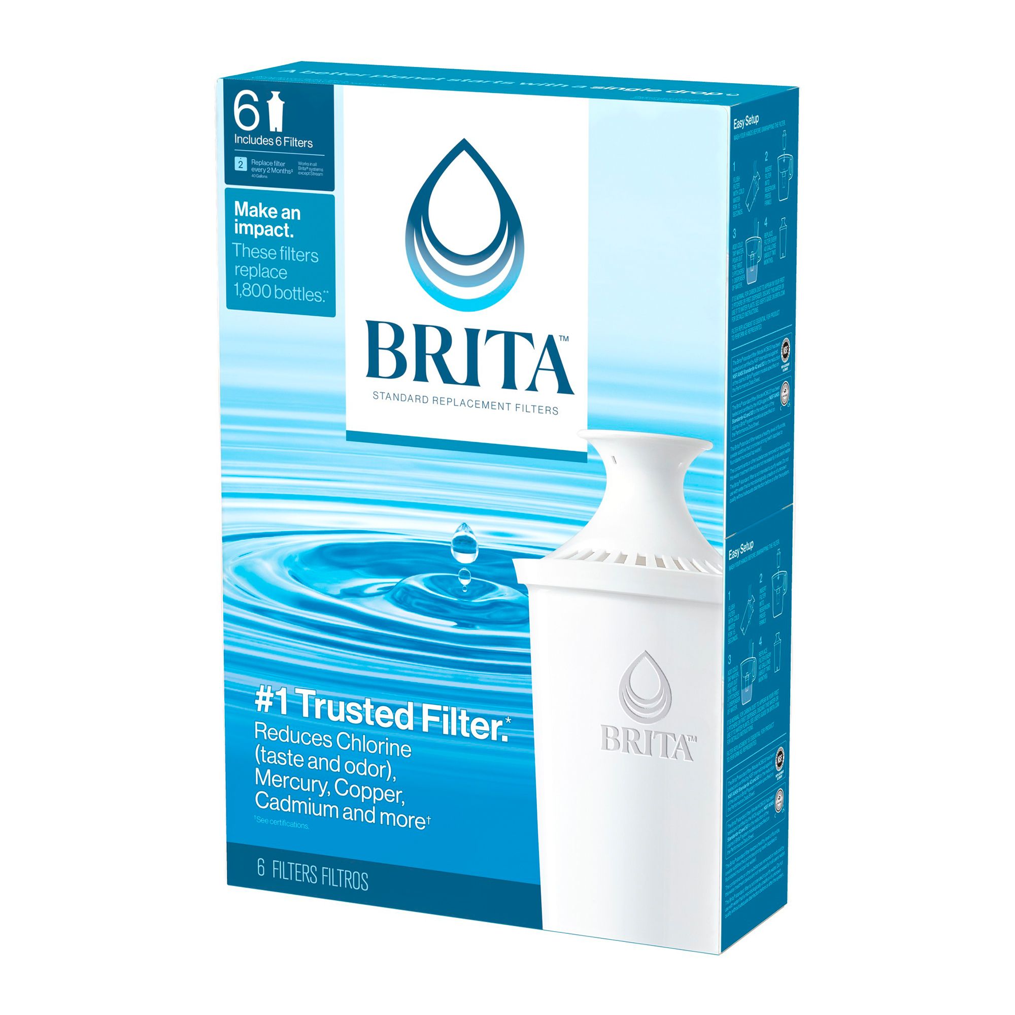 Keep tap water healthier and tasting better when you regularly change your Brita® replacement filter. Made to fit all Brita® pitchers and dispensers, this replacement filter reduces copper, mercury and cadmium impurities that can adversely affect your health over time, while cutting chlorine taste and odor to deliver great tasting water. Designed to leave no black flecks in your water and with no pre-soak required, the Brita® filters are quick and easy to use. Change your Brita® filters every 40 gallons or approximately 2 months for best performance. Start drinking healthier, great tasting water with Brita® today.
