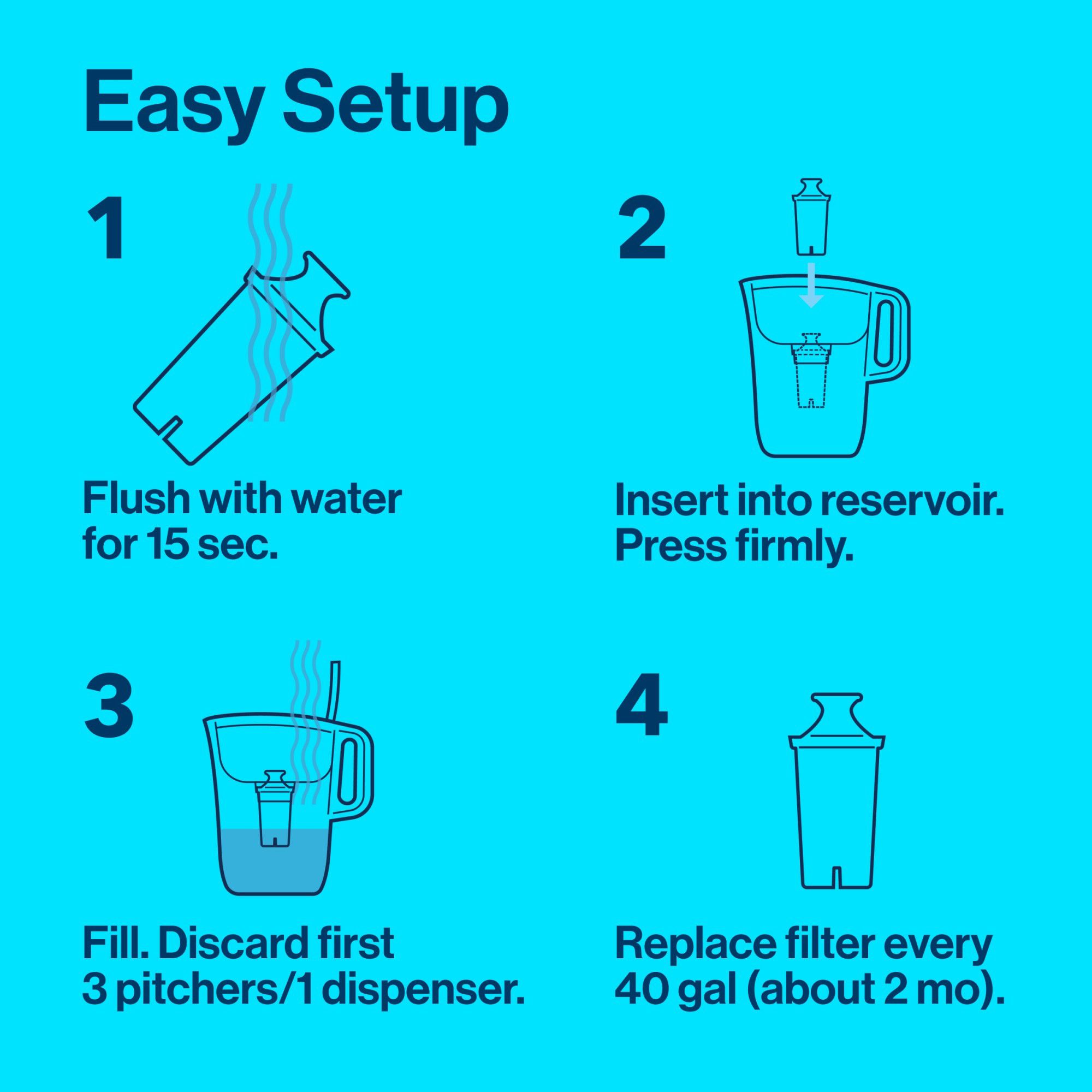 For the best tasting water, replace your water filter after 40 gallons or approximately every 2 months; Brita Standard filters last 2x longer than ZeroWater filters