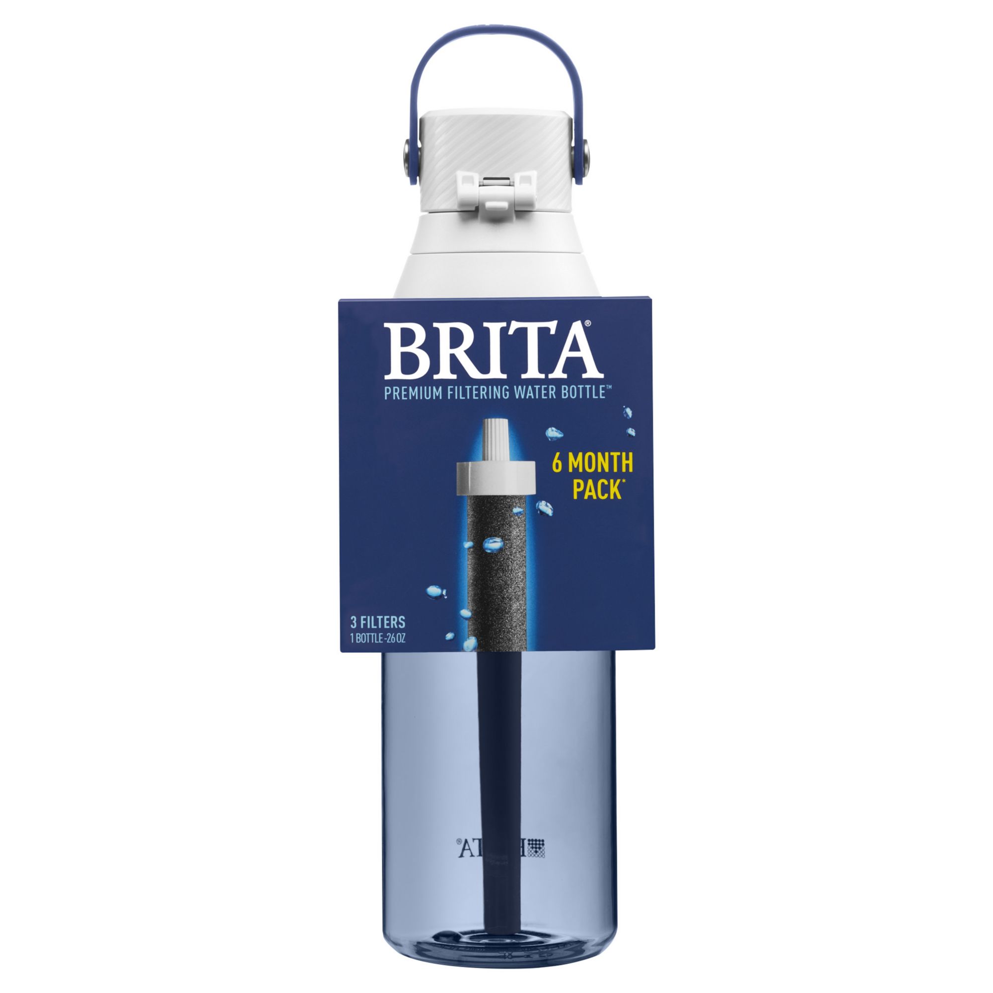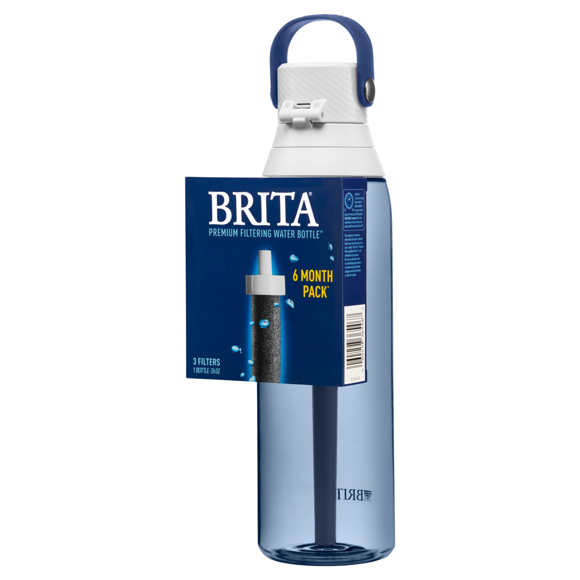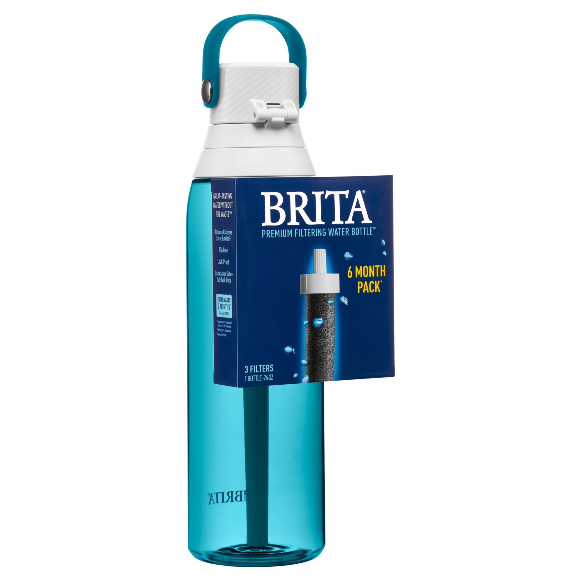 Enjoy great-tasting tap water anywhere with the Brita 26 Ounce Premium Filtering Water Bottle. The durable, BPA-free, plastic bottle includes 3 replaceable filters, which reduces Chlorine (taste & odor) as you drink. Featuring an enclosed, easy-sip straw, built-in carrying loop for grab-and-go portability, and one-handed push button lid, this bottle is designed for effortless convenience. This water bottle is car cup holder friendly and has a leak-proof design to help you avoid surprise drips and spills. Enjoy hassle-free hydration anywhere: at home, the office, a sporting event, or a trip abroad. One bottle filter can replace up to 300 standard 16.9 ounce single-use plastic bottles, so you can stay hydrated, save money, and reduce plastic waste. Brita filtering bottles are easy to clean and dishwasher safe. For best results, replace the filter every 40 gallons or about every two months. With Brita, take filtered water anywhere you go.