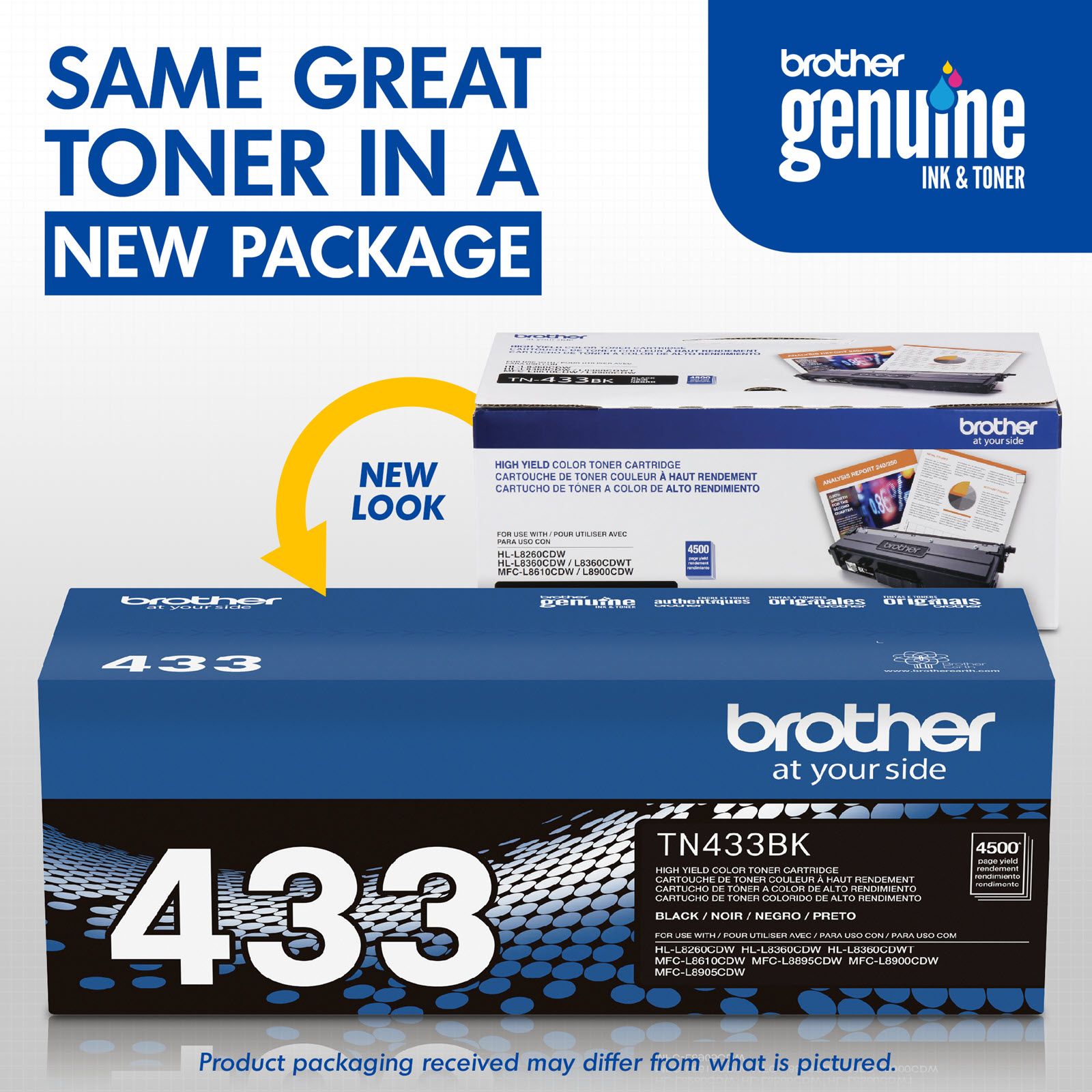 Brother Genuine TN433 High Yield Black toner cartridge Delivers crisp, professional color laser output with 4,500 page yield Designed as part of a complete printing system to provide superior quality results Precisely balanced for even flow and consistent toner distribution on the paper Enjoy ongoing improvements and technical changes, which regularly occur throughout the hardware lifecycle Our Environmental Program enables you to send back your used cartridge free! See www.brother-usa.com/environment for more information Brother Genuine TN433BK Toner Cartridge is for use with the Brother HLL8260CDW, HLL8360CDW, HLL8360CDWT, MFCL8610CDW, MFCL8895CDW, MFCL8900CDW Includes Brother Genuine TN433 High Yield Black toner cartridge
