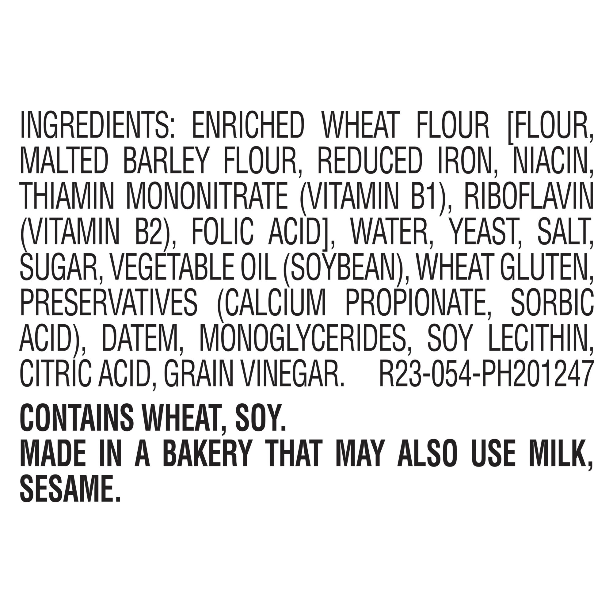 Ingredients Enriched Wheat Flor, Reduced Iron. Niacin, Riboflavin, Yeast, Water, Salt, Vegetable Oil, Wheat Gluten, Sesame Seeds, Citric Acid, Grain Vinegar.
