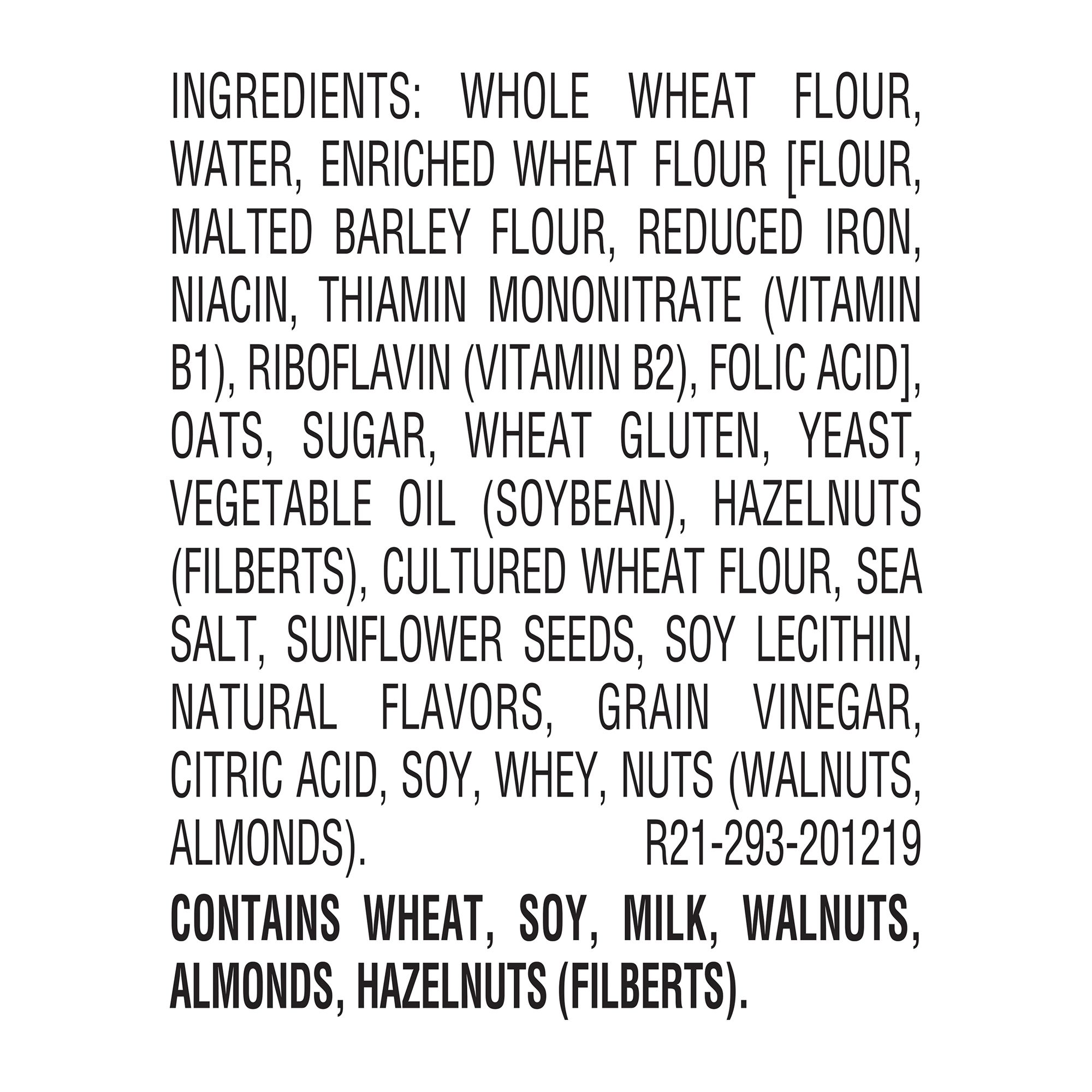 Ingredients Whole Wheat Flour, Water, Whole Grains [Wheat, Rye, Corn, Oats, Millet, Triticale, Brown Rice, Barley], Wheat Gluten, Sugar, Sunflower Seeds, Yeast, Almonds (Nuts), Vegetable Oil (Soybean), Molasses, Flaxseed, Sea Salt, Cultured Wheat Flour, Soy Lecithin, Grain Vinegar, Citric Acid, Soy, Whey, Nuts [Walnuts, Hazelnuts (Filberts)].