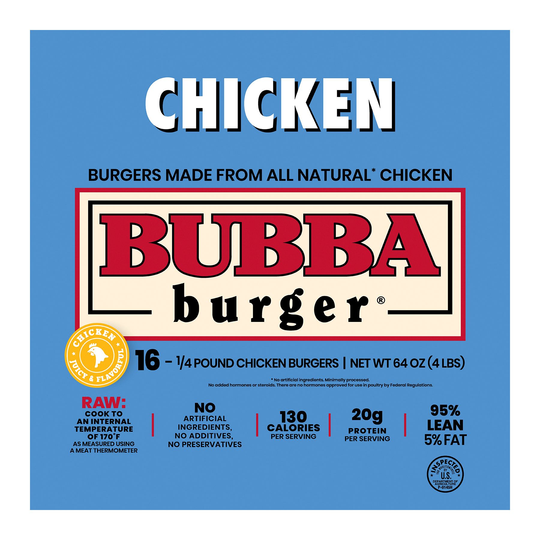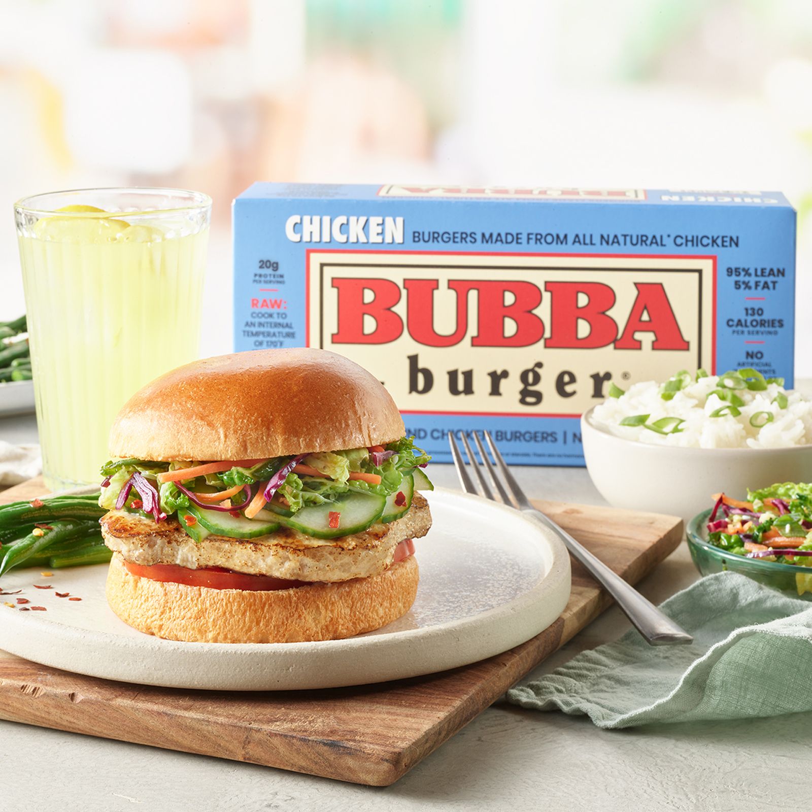 Made with all natural chicken, the irresistible Original Chicken Bubba burger is low in calories and high in protein with a 95/5 lean to fat ratio. Stock up for the family now – this burger is flying out of supermarket freezers!