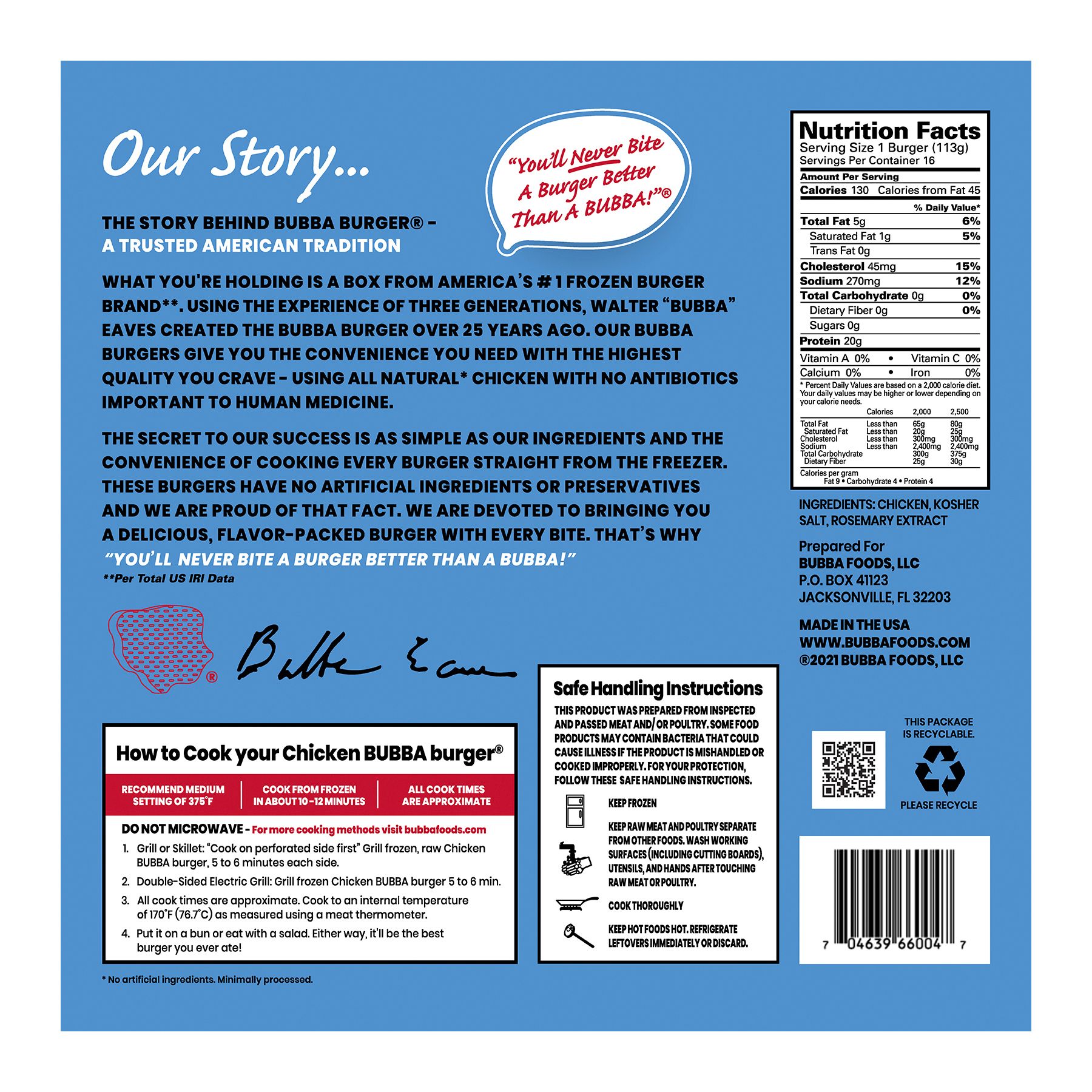 (1) BUBBA Burger Original, Angus Beef OR Sweet Onion, 12 ct./5.3 oz., OR Chicken Burgers, 16 ct./4 oz.