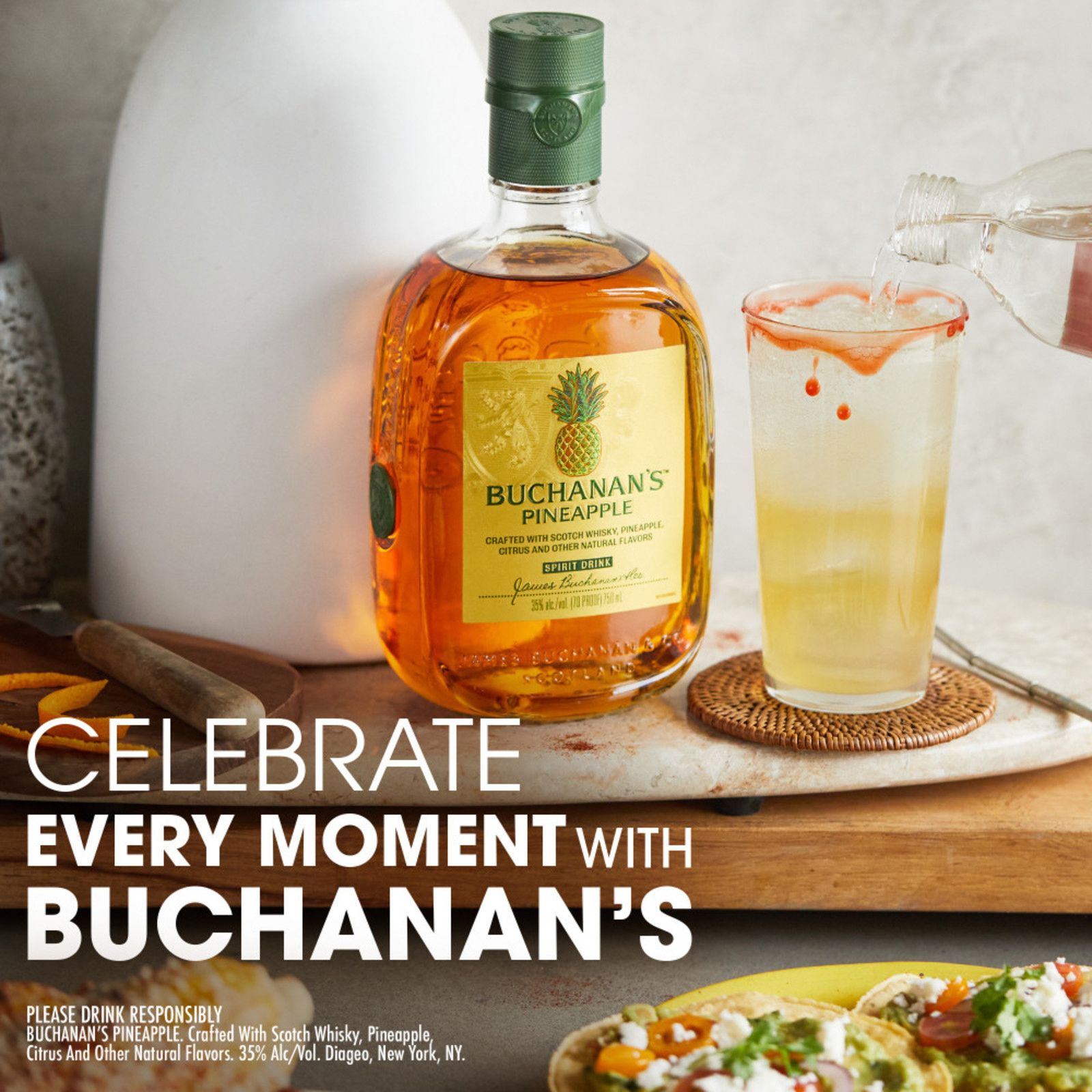 Buchanan’s has brought over 130 years of whisky-making experience to new, vibrant heights with Buchanan's Pineapple (Scotch Whisky with Pineapple, Citrus, and other Natural Flavors). This uniquely sophisticated drink pairs the light caramel and vanilla notes from scotch whisky from the House of Buchanan's with the lush, bright flavor and aroma of juicy pineapple. A nose of vibrant pineapple and hints of zesty citrus gives way to a lingering and bright tropical finish. Perfect for a Buchacolada cocktail. Includes one 70 proof 750 mL bottle of Buchanan's Pineapple. Please drink responsibly.