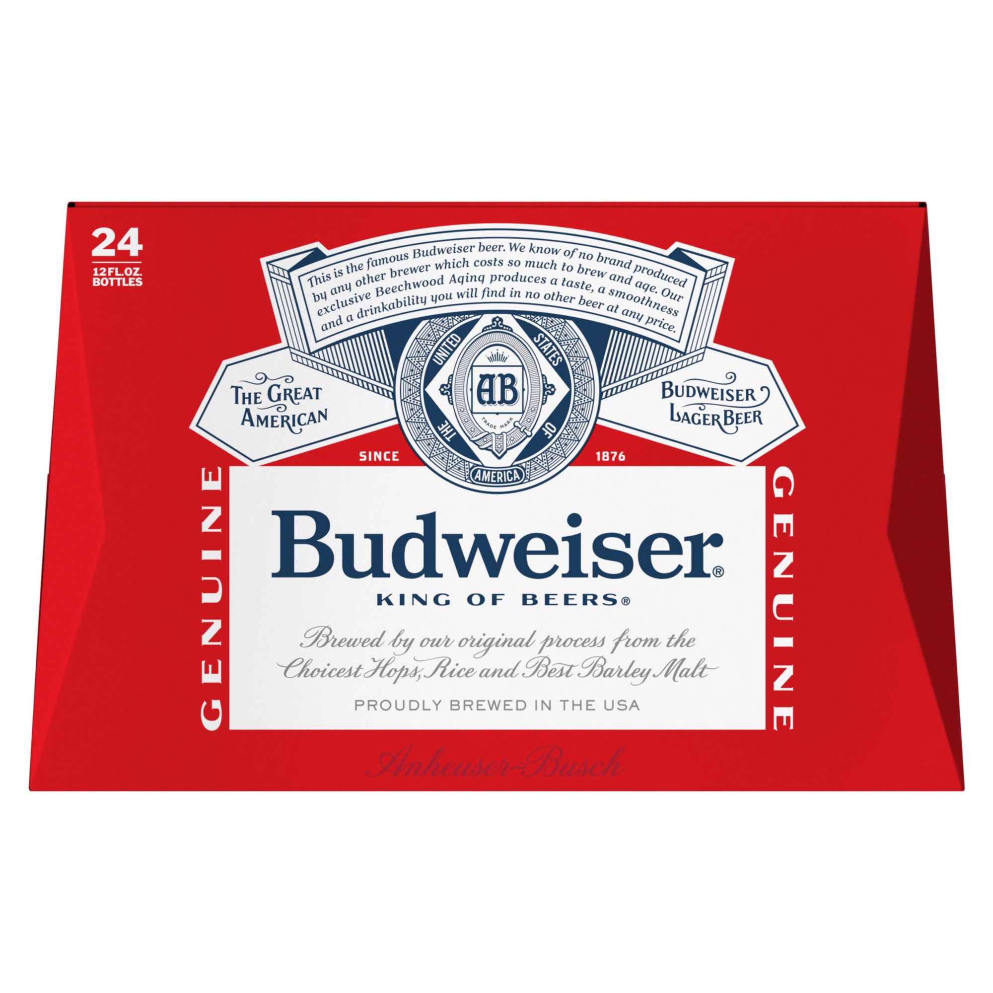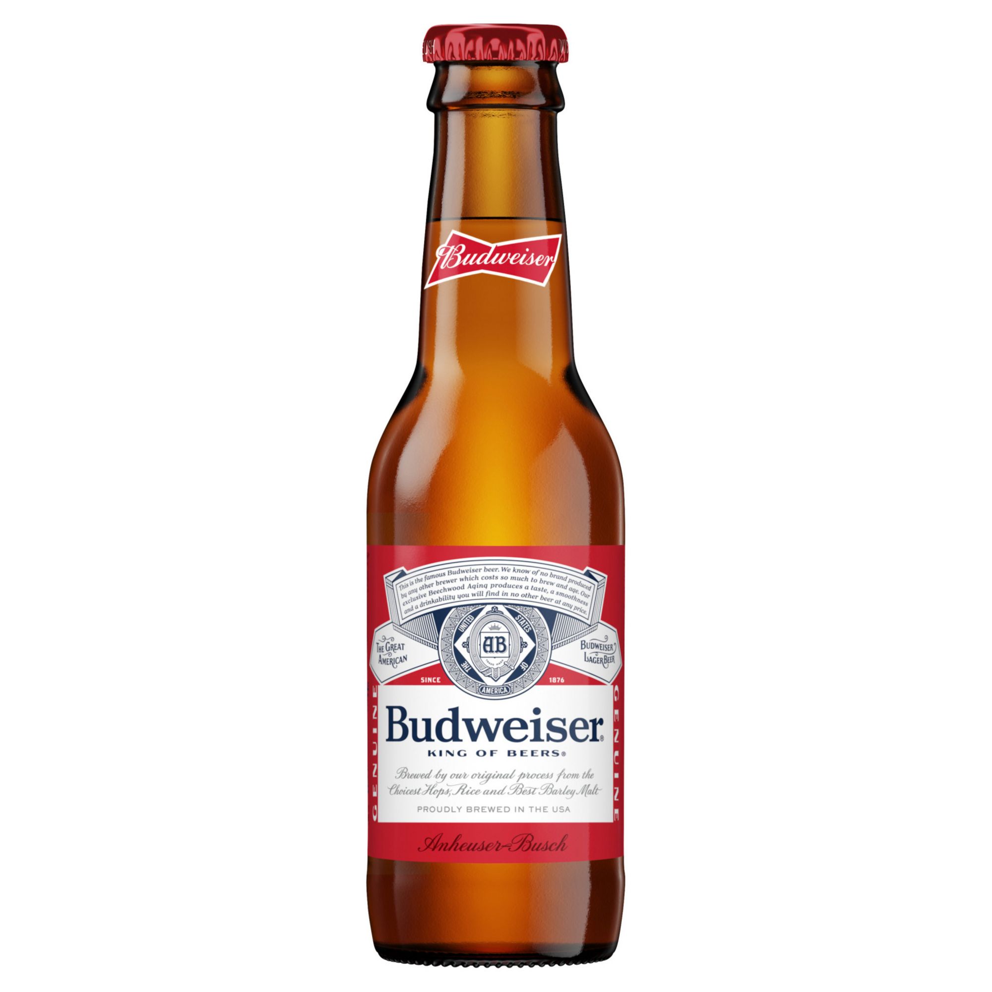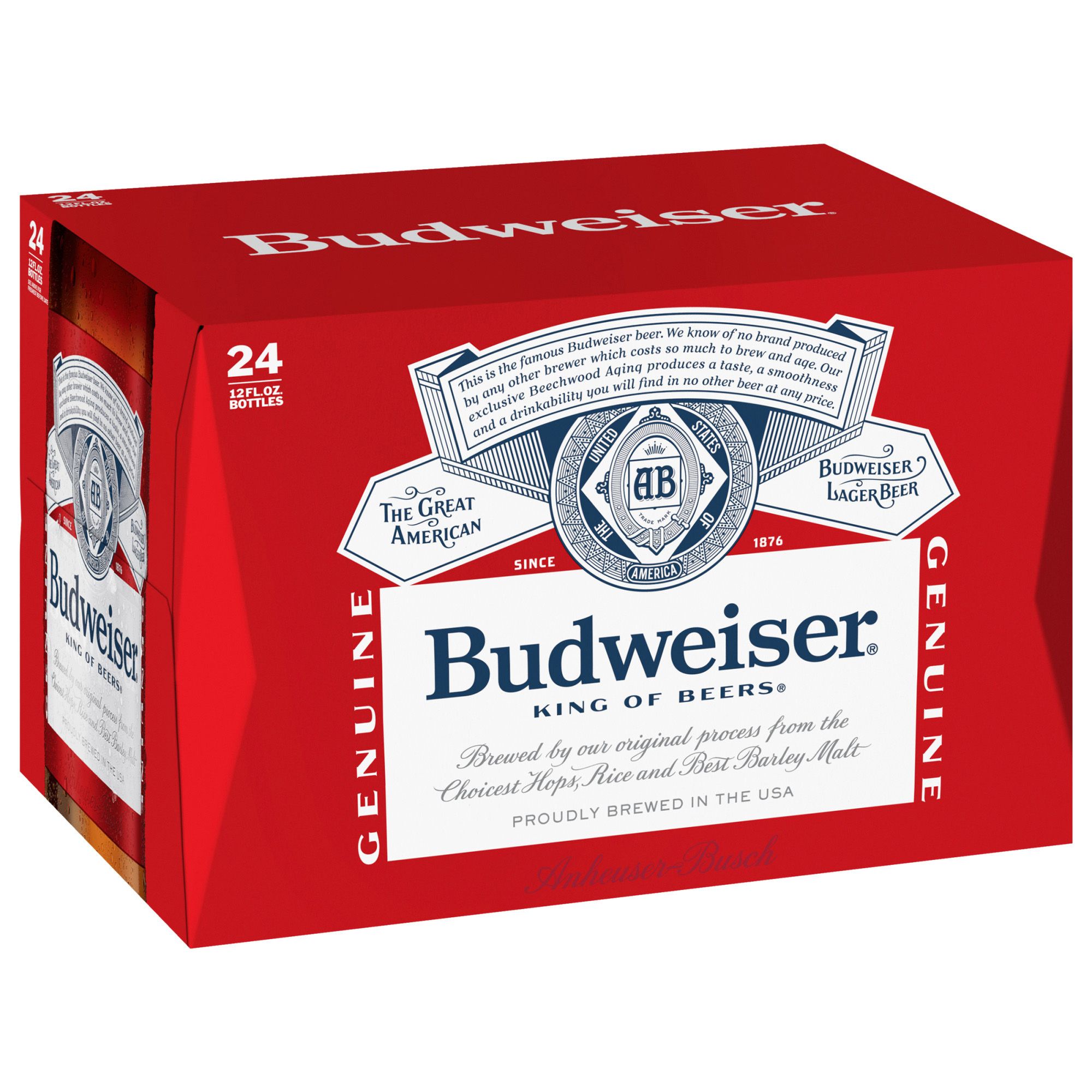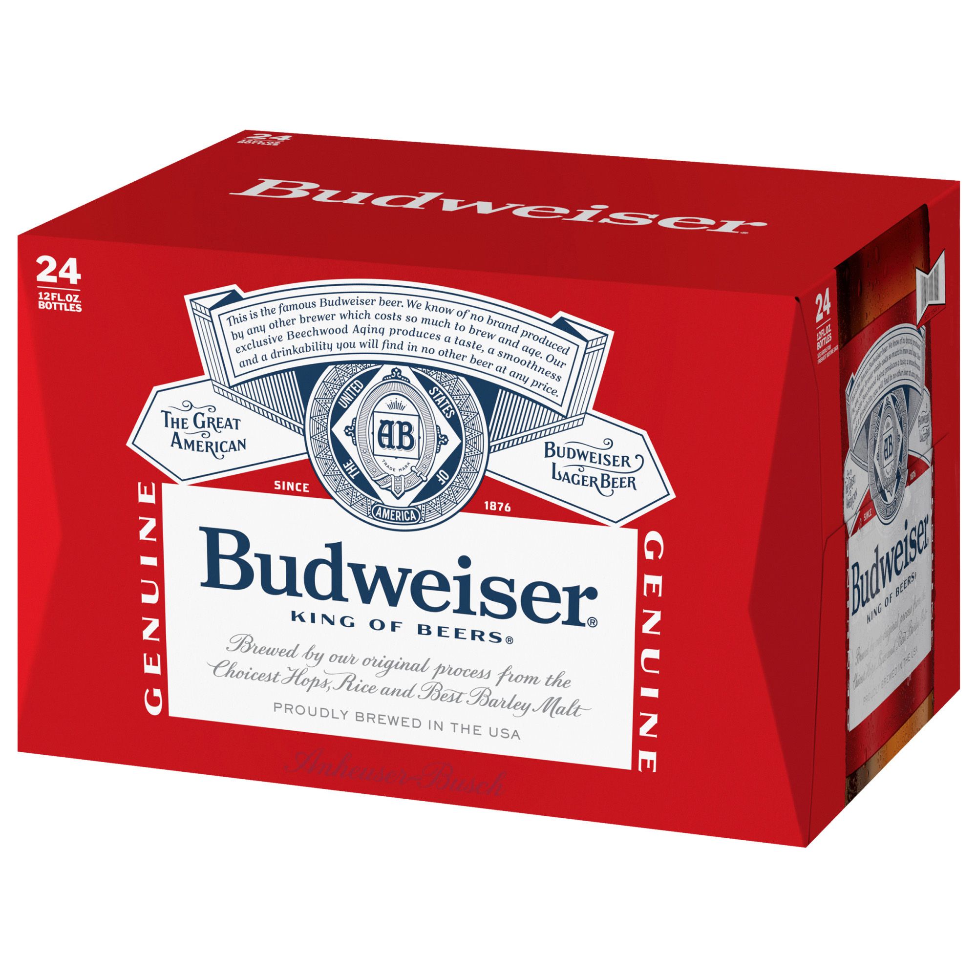 Budweiser beer is a medium-bodied, American-style lager beer. Brewed with high quality barley malt, a blend of premium hop varieties, fresh rice and filtered water, this American beer is crisp and full of flavor. Budweiser beer has 5% ABV and contains 145 calories and zero grams of fat per serving. Every occasion calls for a Budweiser; enjoy a cold beer while watching the game or grab a pack when your barbecues or social gatherings need refreshing drinks. This lager beer is the perfect companion to pizza, burgers and fried chicken, but don't let the pairings stop there. The beer bottles and package make this beer easy to transport wherever Budweiser is needed.
