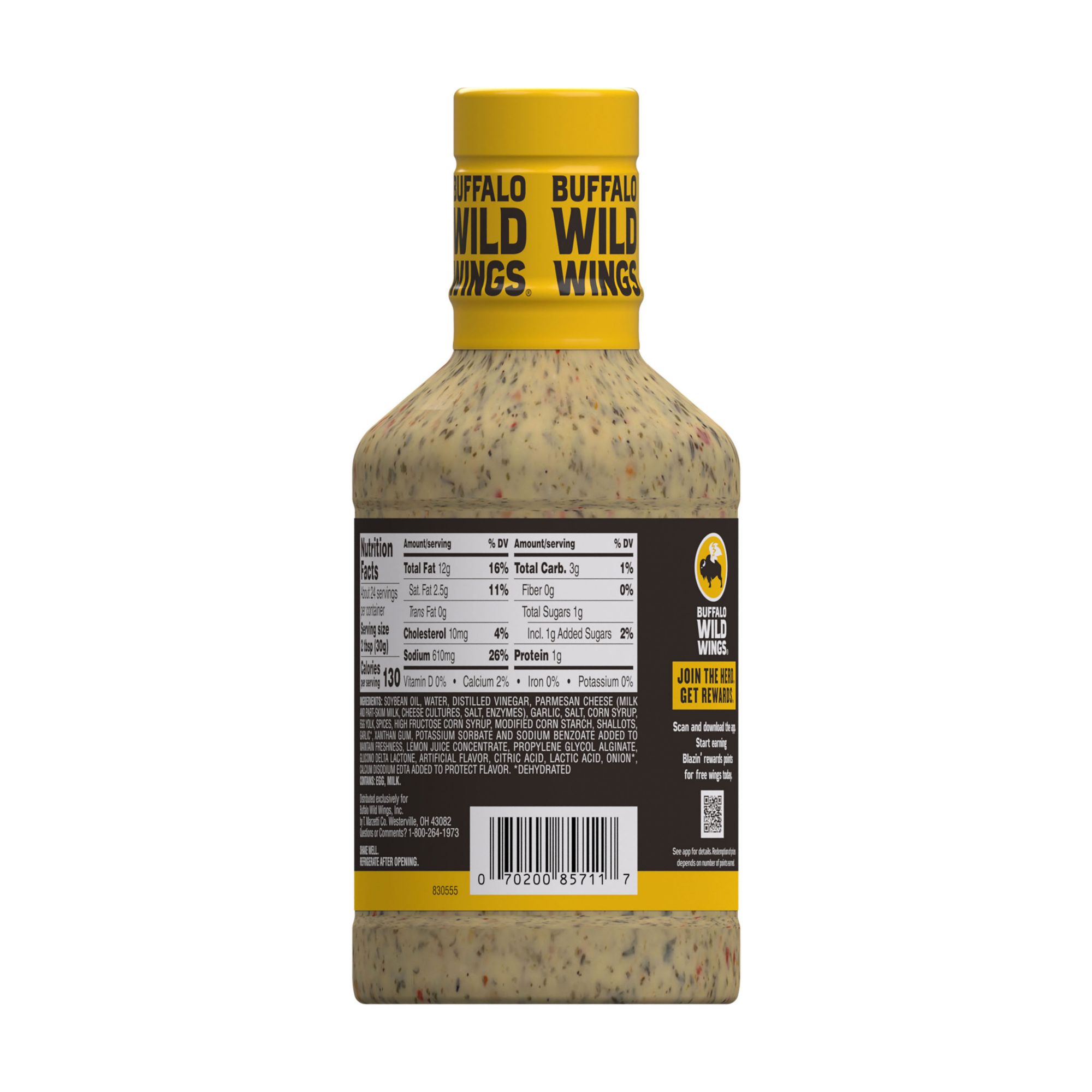 Enjoy delicious Italian flavors at home with Buffalo Wild Wings Parmesan Garlic Sauce. Crafted with parmesan cheese, Italian herbs and spices, vinegar and garlic, this Parmesan Garlic Sauce satisfies any party or dinner table. Use this sauce as a dip, marinade, glaze or topping and add some Italian comfort to your favorite recipes. Elevate your chicken parmesan recipe, burger spread or chicken wing sauce with this delicious, versatile sauce. Founded in 1982, Buffalo Wild Wings has continued to deliver unique flavors for fans everywhere through a wide variety of sauces that can be enjoyed at the sports bar or at home.
