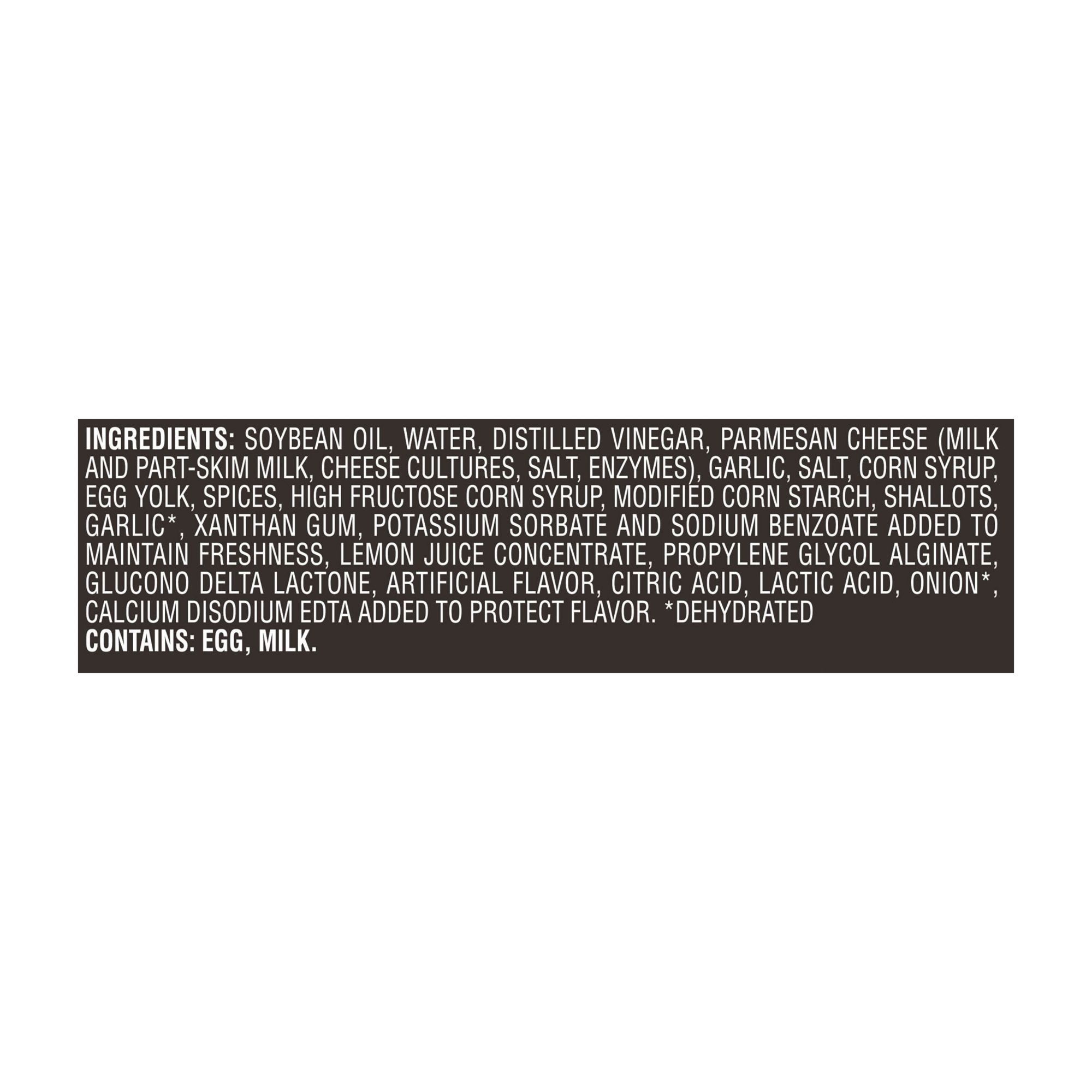 Ingredients: Soybean Oil, Water, Distilled Vinegar, Parmesan Cheese (Milk and Part-Skim Milk, Cheese Cultures, Salt, Enzymes), Garlic, Salt, Corn Syrup, Egg Yolk, Spices, High Fructose Corn Syrup, Modified Corn Starch, Shallots, Garlic (Dehydrated), Xanthan Gum, Potassium Sorbate and Sodium Benzoate Added to Maintain Freshness, Lemon Juice Concentrate, Propylene Glycol Alginate, Glucono Delta Lactone, Artificial Flavor, Citric Acid, Lactic Acid, Onion (Dehydrated), Calcium Disodium EDTA Added to Protect Flavor.