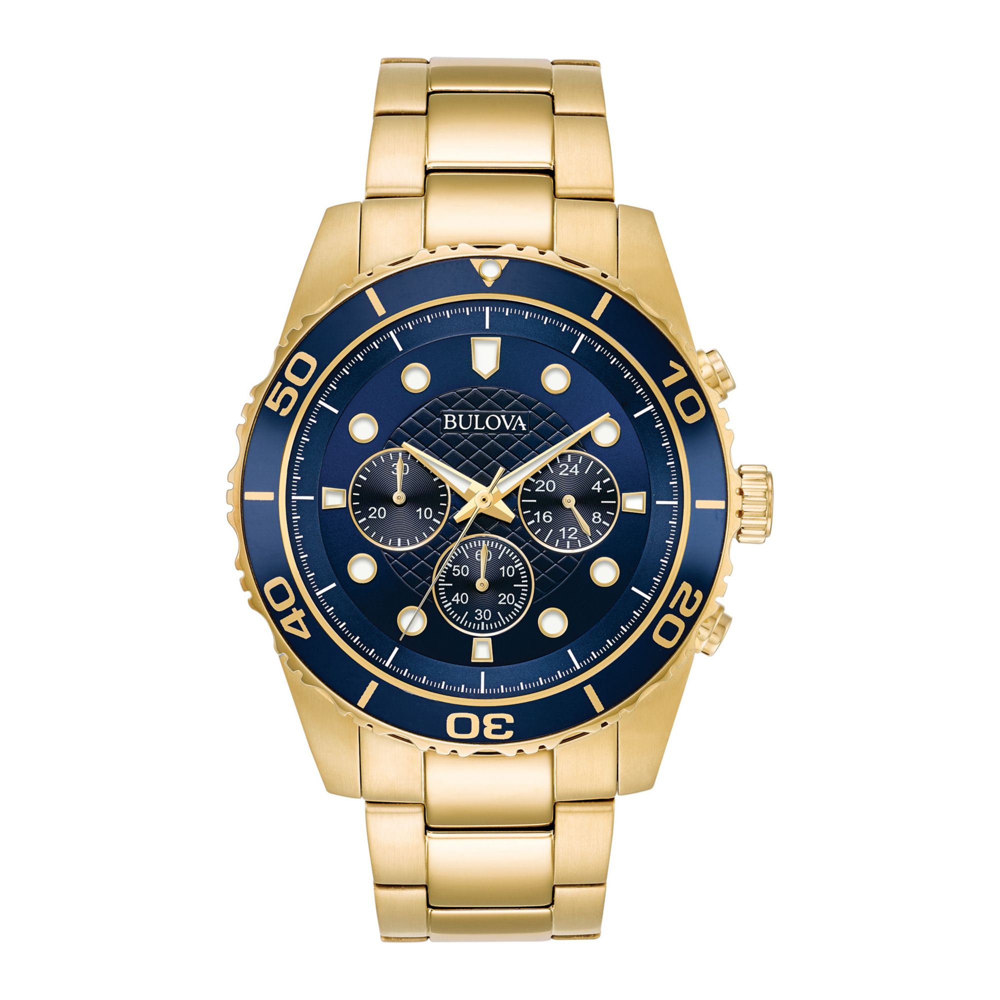 Uncompromising timekeeping in a sporty style, that's what Bulova brings you with this chronograph watch. The unidirectional rotating bezel surrounds a navy blue dial with mineral glass which features luminous hands and hour markers in a stainless steel goldtone case, cross hatched texture in the center of the dial adds interest and makes room for three subdials at 3:00, 6:00 and 9:00 on a gold-case and stainless steel bracelet with deployment fold-over clasp and water resistant up to 100 meters.