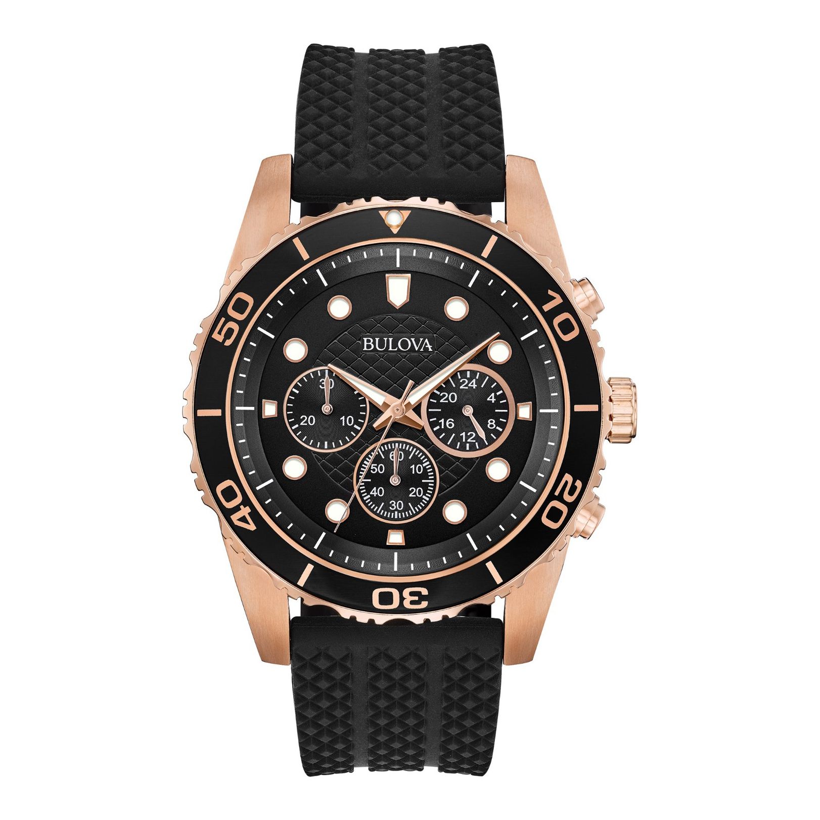 Bulova 98A192 Sport Watch featuring a Black dial enhanced by luminous rose gold-tone hands, Rose Gold-tone stainless steel case with a Uni-directional Rotating bezel, Scratch Resistant Mineral crystal, Solid stainless caseback on a black rubber strap with buckle closure, Quartz movement and up to 100 meters water resistance. Case size 44 mm x 12 mm, Band 20 mm x long.