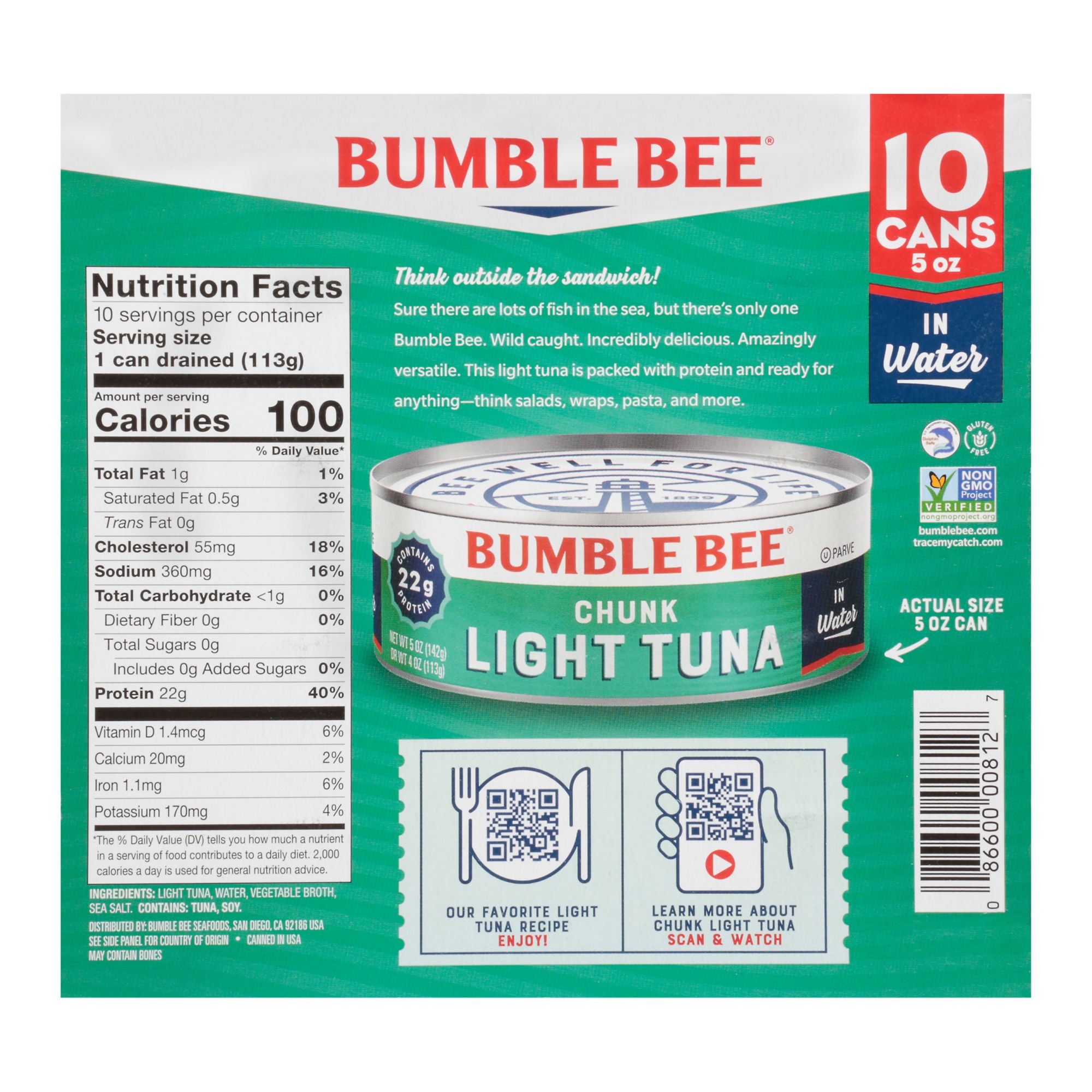 High-quality protein Vitamin and minerals Rich in omega-3 fatty acids Gluten free and kosher Dolphin-safe policy Packed in water Includes ten 5-oz. cans
