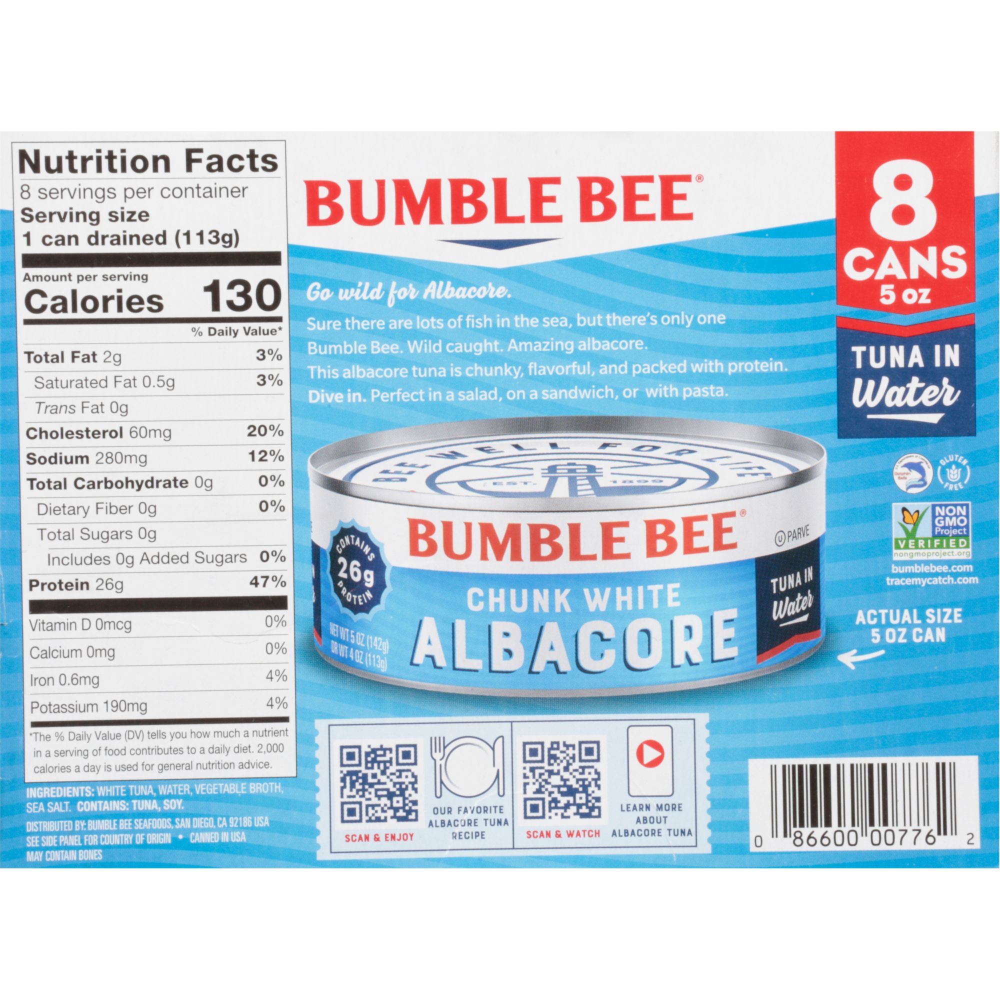 Bumble Bee Chunk White Albacore Tuna is an excellent source of high-quality protein, vitamins and minerals, and is low in saturated fat.