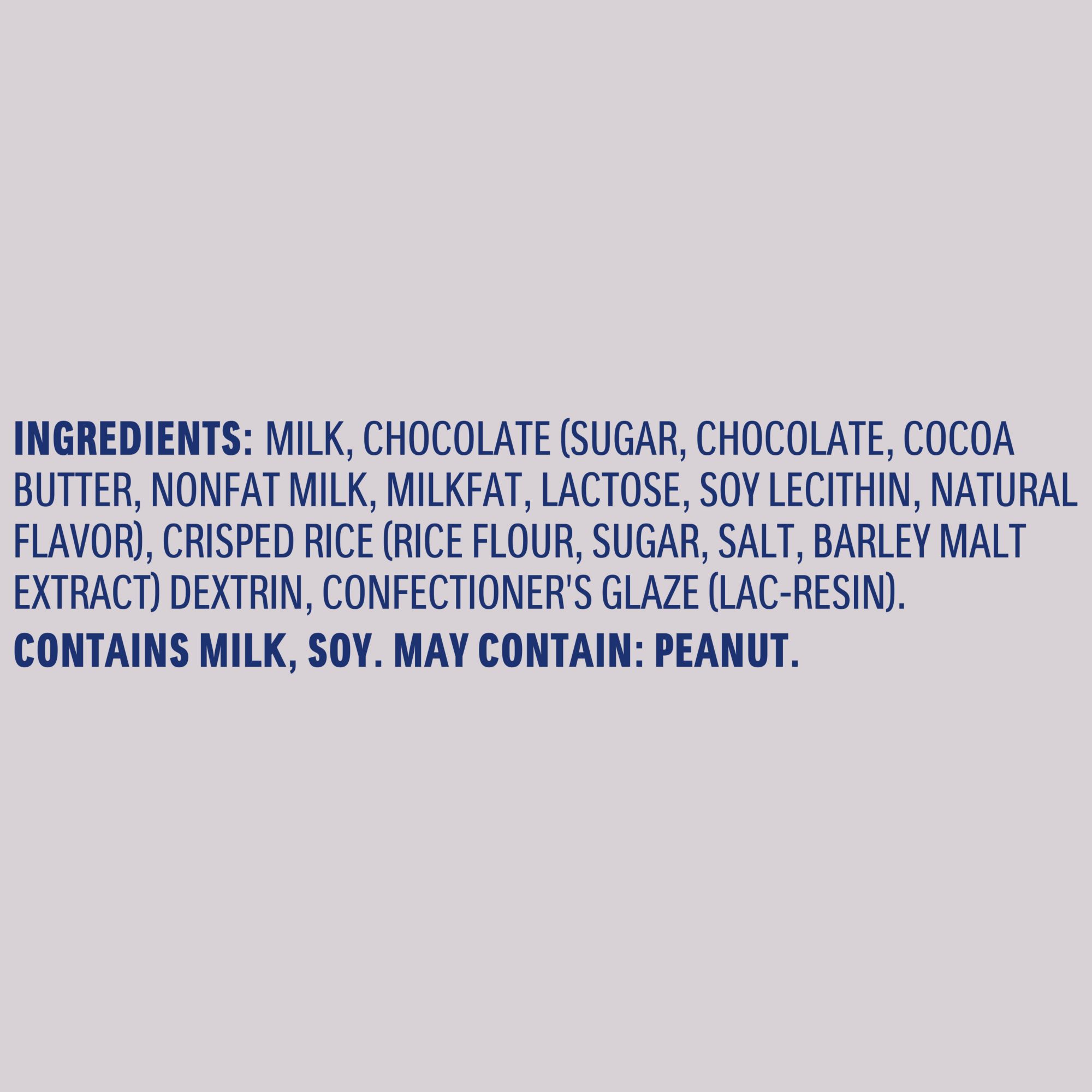 Ingredients: Milk Chocolate (Sugar, Chocolate, Cocoa Butter, Nonfat Milk, Milkfat, Lactose, Soy Lecithin, Natural Flavor), Crisped Rice (Rice Flour, Sugar, Salt, Barley Malt Extract), Tapioca Dextrin, Confectioners Glaze (Lac-resin).