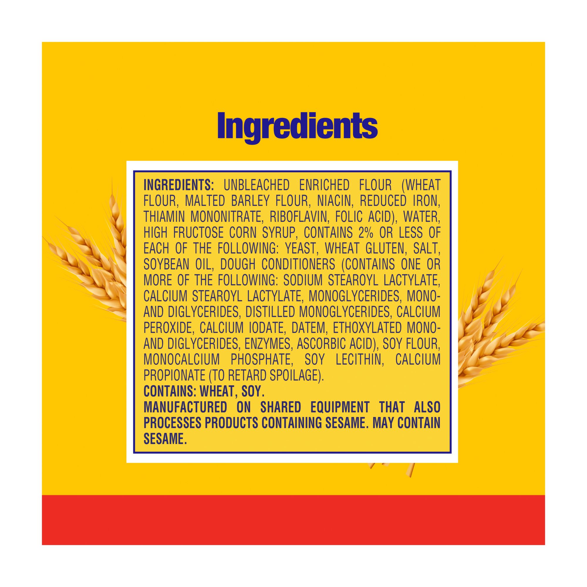 Ingredients Unbleached Enriched Flour (Wheat Flour, Malted Barley Flour, Niacin, Reduced Iron, Thiamin Mononitrate, Riboflavin, Folic Acid), Water, High Fructose Corn Syrup, Contains 2% or Less of Each of the Following: Yeast, Wheat Gluten, Salt, Soybean Oil, Dough Conditioners (Contains One or More of the Following: Sodium Stearoyl Lactylate, Calcium Stearoyl Lactylate, Monoglycerides, Mono- and Diglycerides, Distilled Monoglycerides, Calcium Peroxide, Calcium Iodate, DATEM, Ethoxylated Mono- and Diglycerides, Enzymes, Ascorbic Acid), Soy Flour, Soy Lecithin, Monocalcium Phosphate, Calcium Sulfate, Calcium Carbonate, Calcium Propionate (to Retard Spoilage). Contains: wheat, soy. Manufactured on shared equipment that also processes products containing sesame. May Contain sesame.