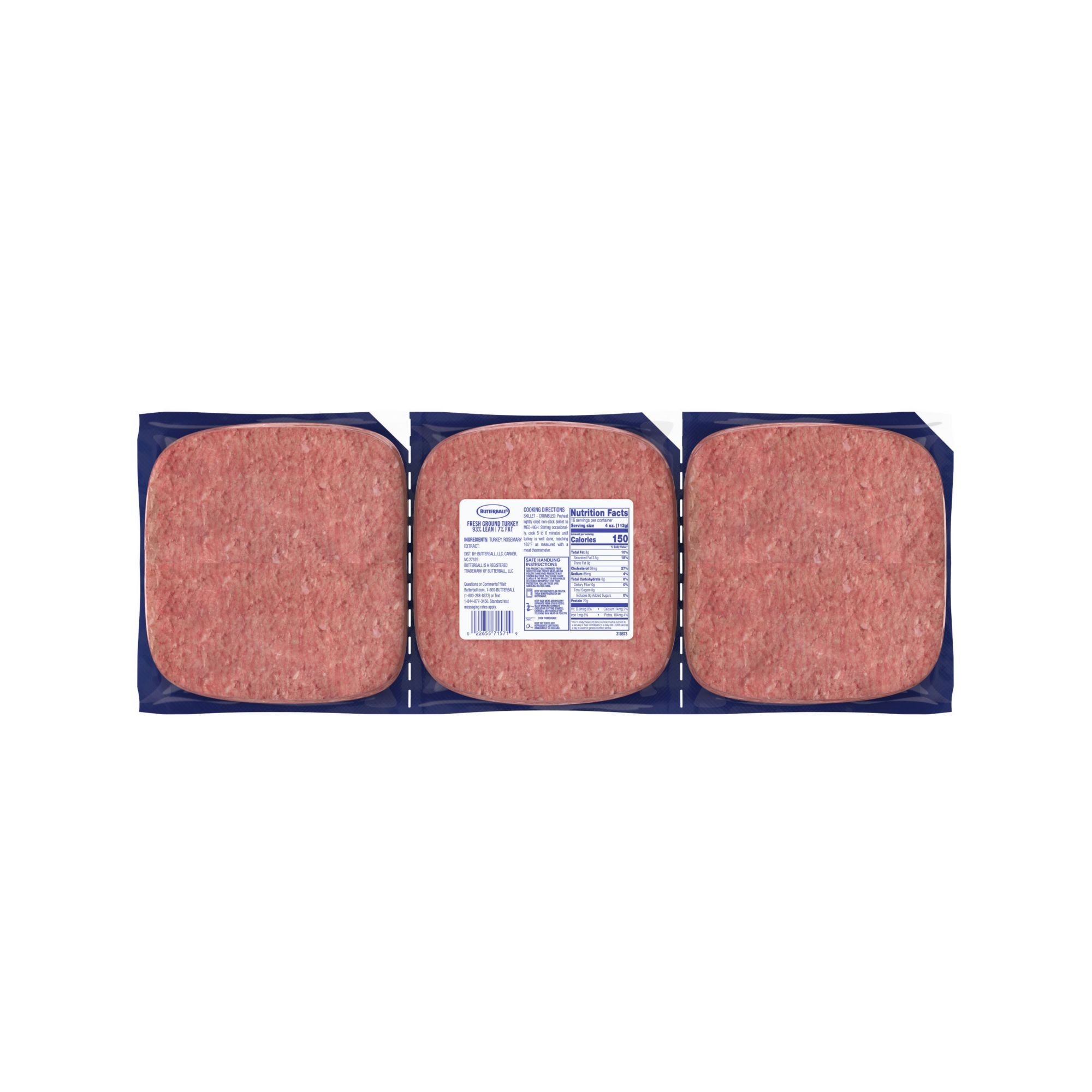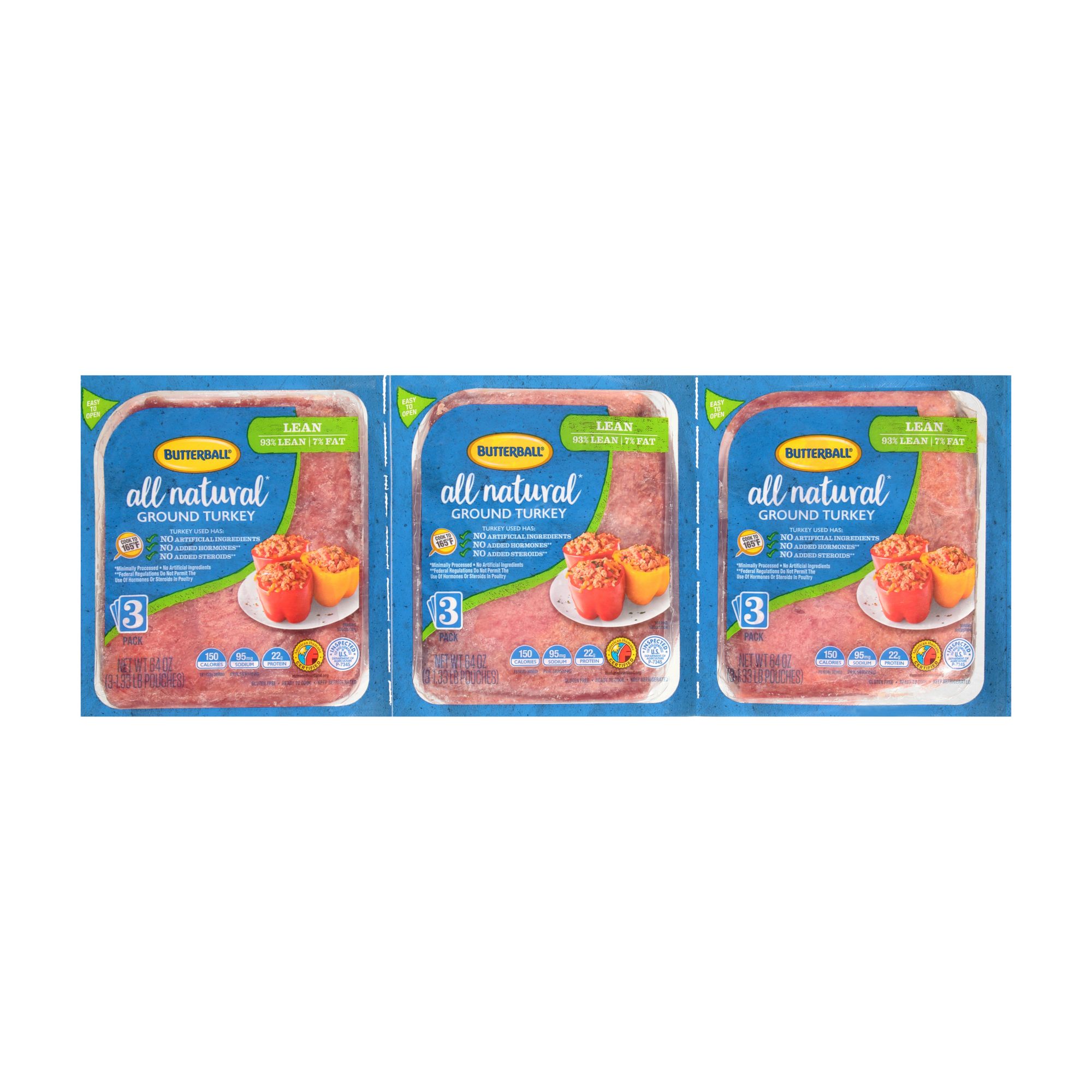 Make Butterball 93% lean ground turkey meat the star of your favorite recipe for a low-fat, gluten-free meal. Always tender and juicy, all natural* Butterball turkey is minimally processed with no artificial ingredients and no hormones or steroids,** so you can feel good about the food you put on the table. With 19 grams of protein per serving, Butterball ground turkey provides an easy way to add lean protein to your weeknight meals. Enjoy this family-sized package of fresh turkey meat all year long for family dinners, party appetizers or grilled lunches. Explore all the possibilities - from turkey tacos to turkey chili - with recipes on Butterball.com.
