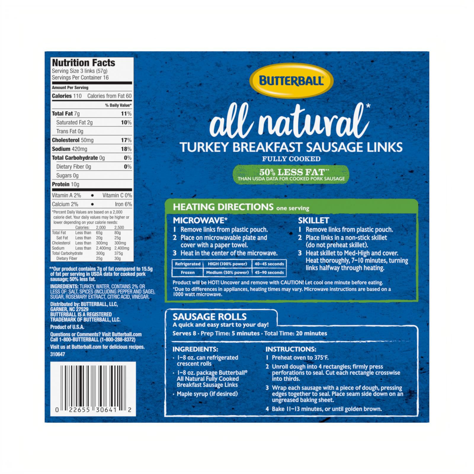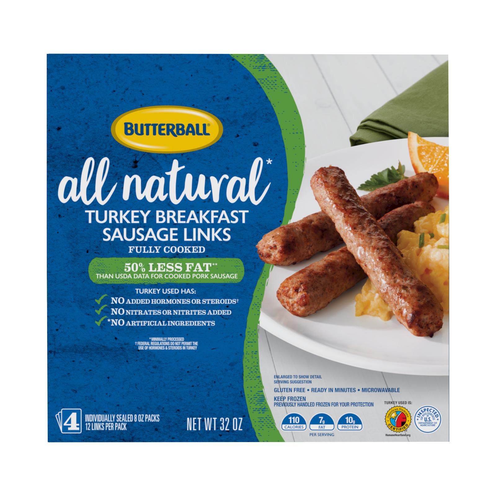 Fully cooked Butterball turkey sausage is perfect with breakfast, as a high-protein snack, added to appetizers, and much more. This all natural, minimally processed sausage is gluten free. This turkey sausage is deliciously seasoned and ready in minutes. It contains 50% less fat* than USDA data for cooked pork sausage. Turkey used has no added hormones or steroids**. No nitrates or nitrites added. Visit Butterball.com for delicious recipes. Product of U.S.A. Turkey used is American Humane Certified.