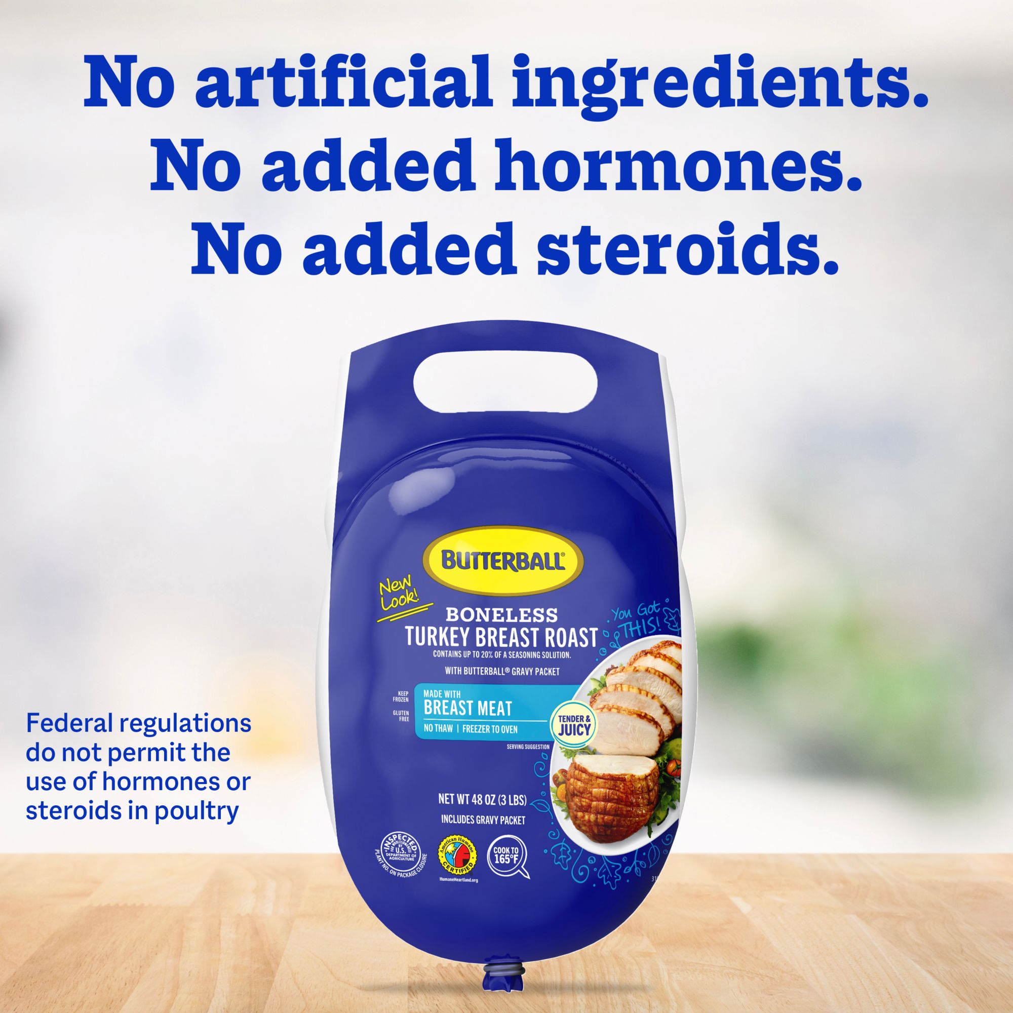 Imagine the aroma of roasted turkey filling your kitchen without the hassle of carving. Butterball All Natural Frozen Boneless Turkey Breast Roast delivers tender, juicy turkey breast - and 21 grams of protein per serving. Made with no artificial ingredients, hormones, or steroids*, this all-natural** turkey is perfect for small gatherings or weeknight dinners. This perfectly seasoned, boneless roast eliminates the mess and fuss of bone-in turkey, allowing you to focus on what matters most - enjoying a delicious meal with loved ones. Today, we turkey. *Federal regulations prohibit the use of hormones and steroids in poultry. **All Natural means no artificial ingredients and minimally processed.