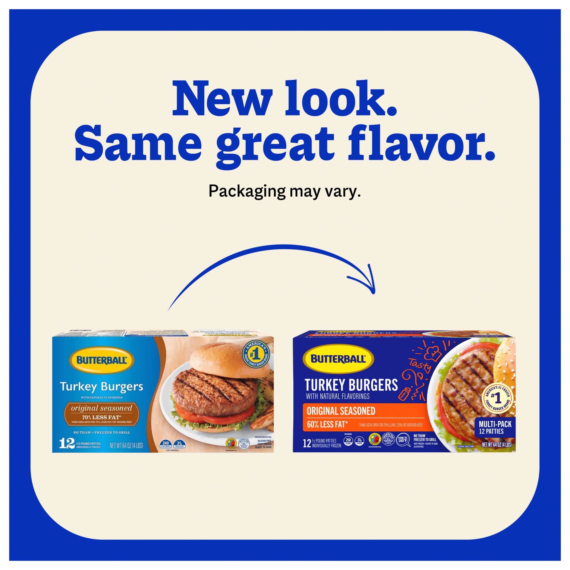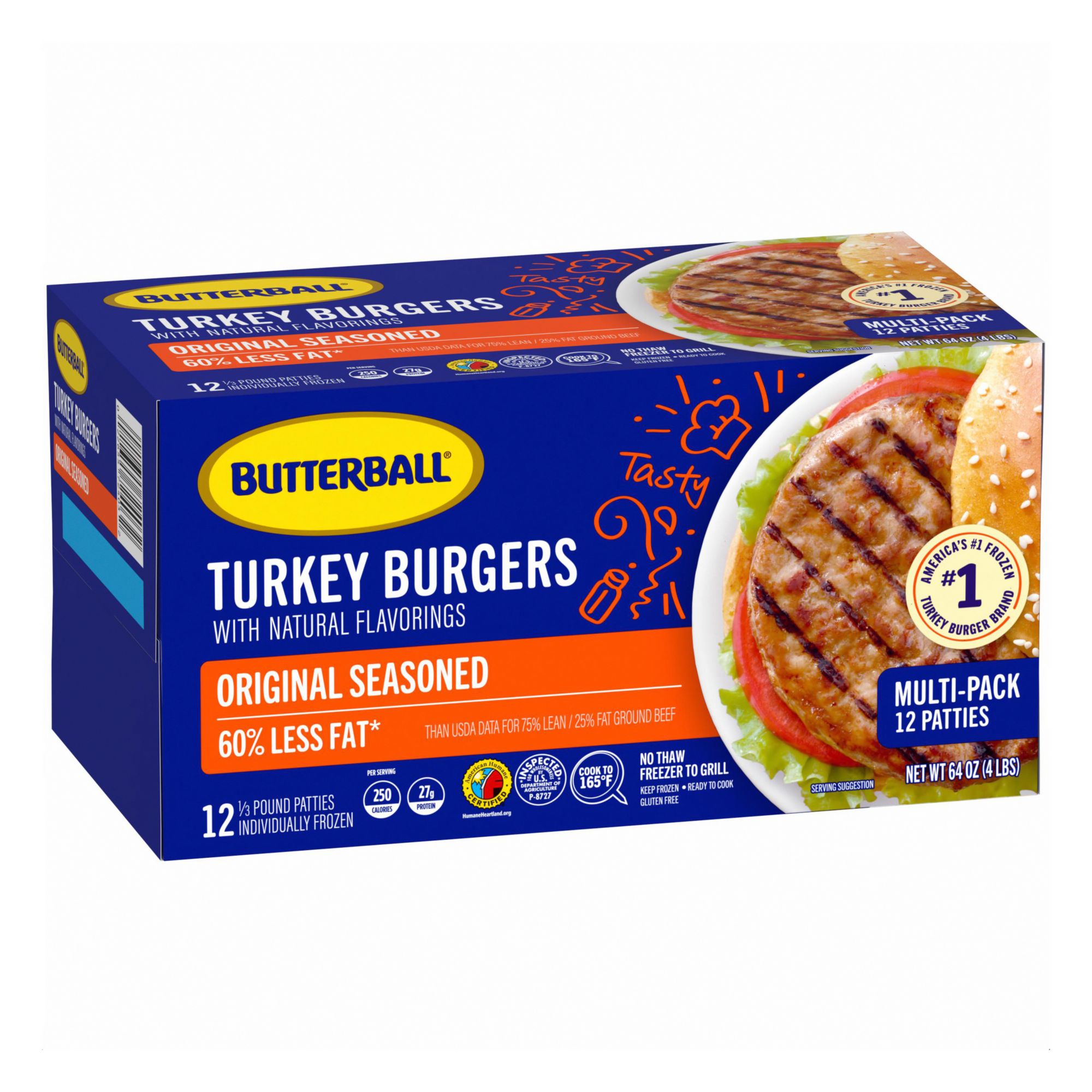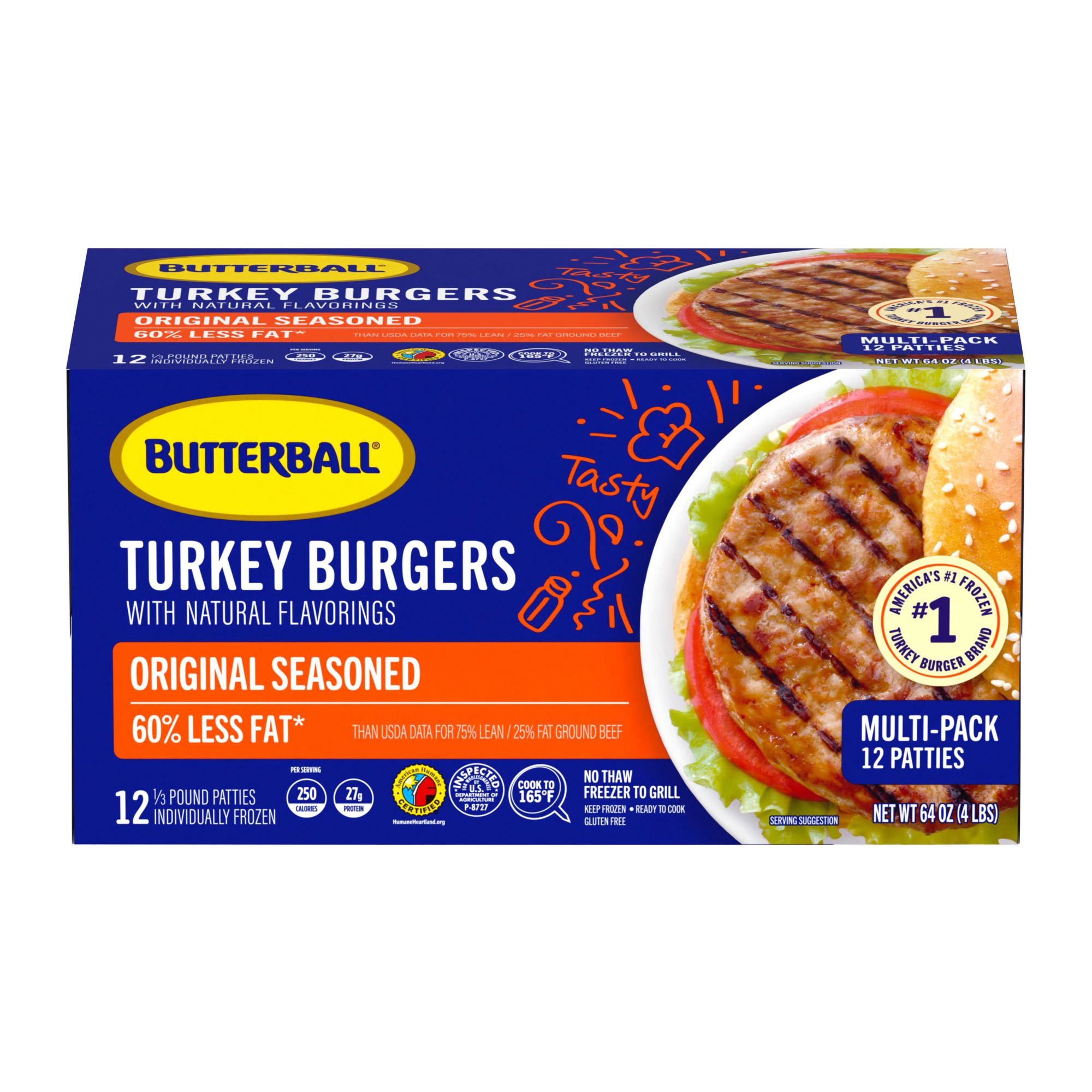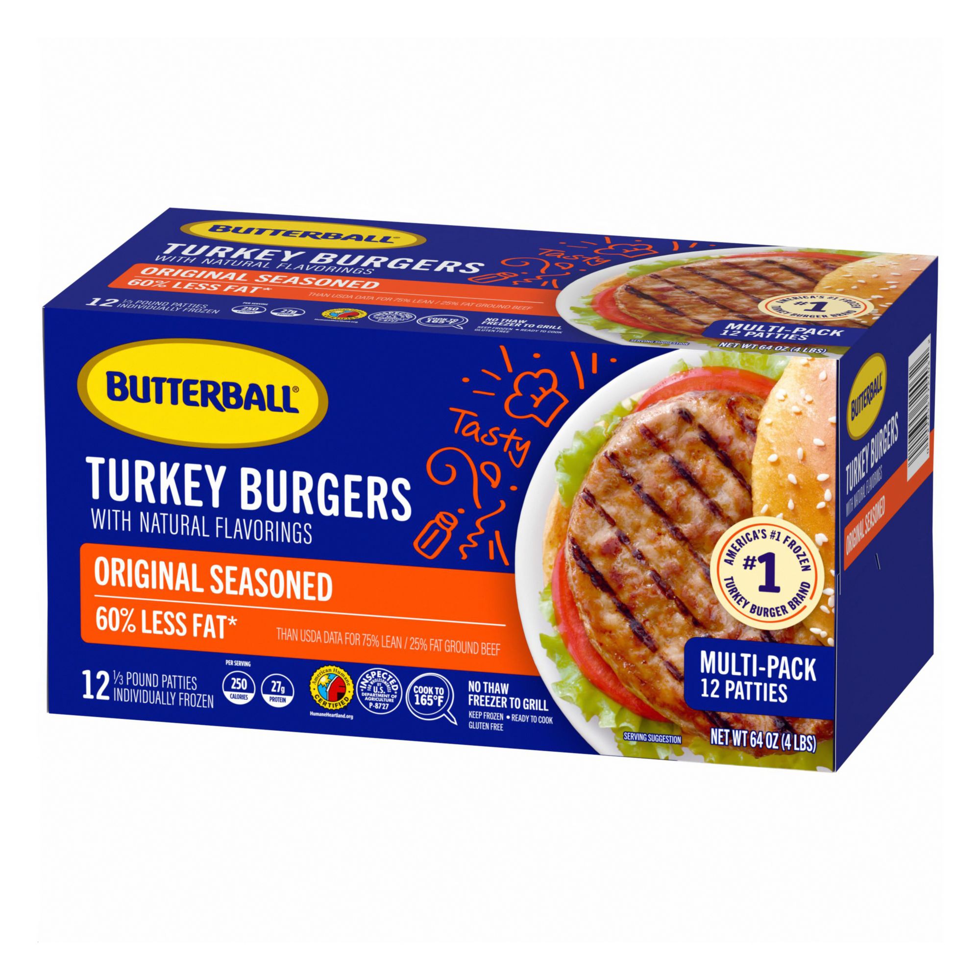 Get ready to feed a crowd with a 12-pack of Butterball Original Seasoned Frozen Turkey Burgers. These burgers offer a convenient way to share a great meal with someone you love. These burgers go straight from the freezer to the grill or skillet, eliminating the need for thawing and saving you valuable time. Each bun-covering burger patty is expertly seasoned to deliver a juicy, savory flavor that rivals traditional beef burgers but with fewer calories and less fat, supporting a balanced diet. Packed with high-quality lean turkey, each serving contains 28 grams of protein. Perfect for any meal occasion, these versatile gluten-free burgers are ideal for backyard BBQs, quick weeknight dinners or casual get-togethers. Choose Butterball Original Seasoned Turkey Burgers for a flavorful, convenient and nutritious addition to your meal rotation because, today, we turkey.