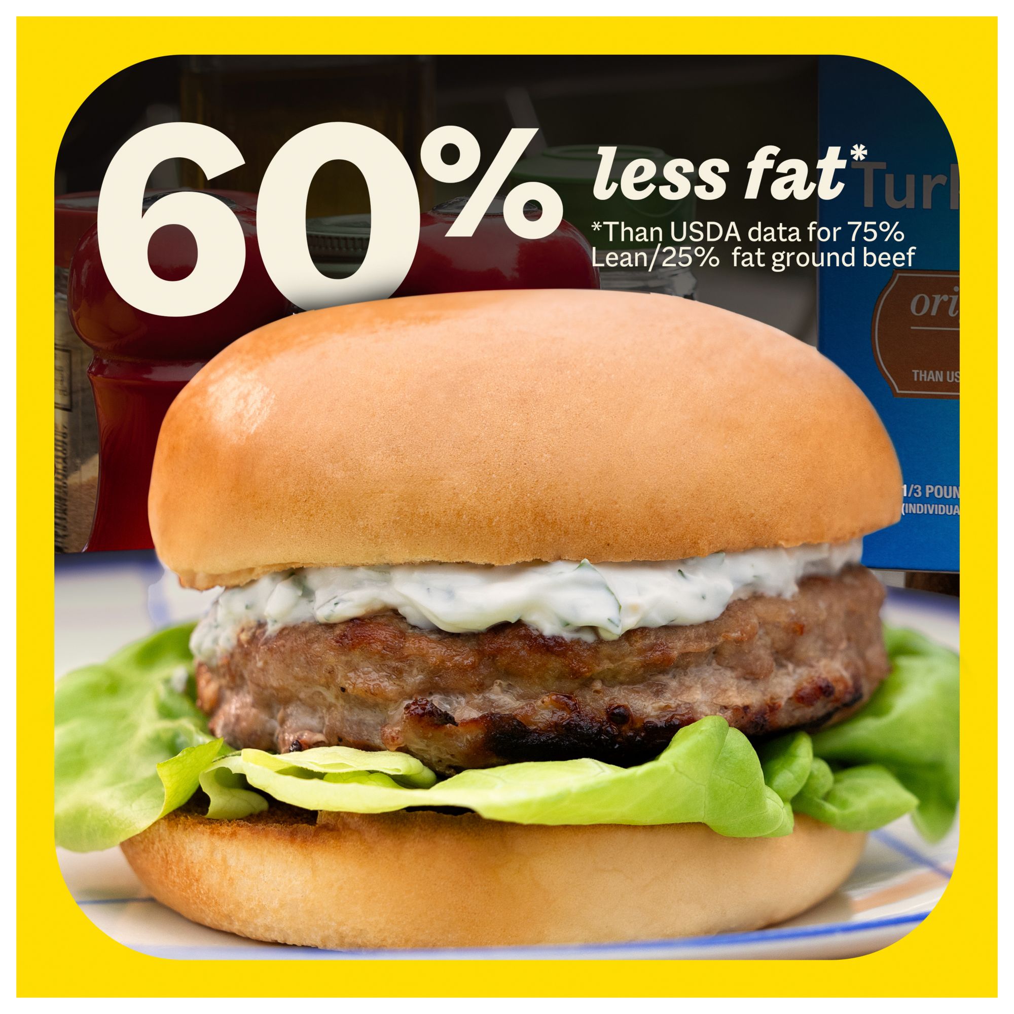 Butterball gluten-free turkey burgers have 60% less fat than USDA data for 75% lean/25% fat ground beef