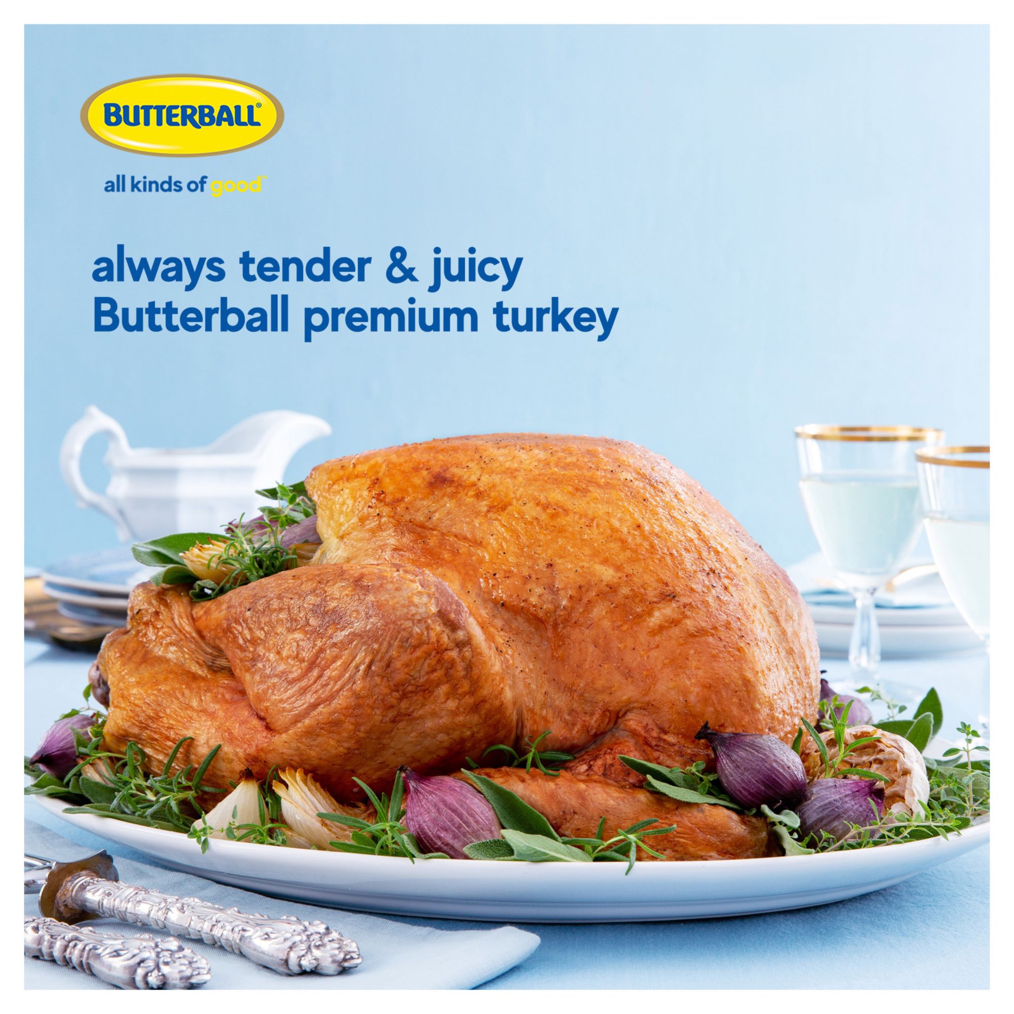 Always tender and juicy, Butterball turkeys are individually pre-brined, making it easy to take your turkey from packaging to pan with little effort. Plus, All Natural* Butterball turkeys are minimally processed and have zero artificial ingredients, hormones or steroids,** so you can feel good about the food you put on the table. With 21 grams of protein per serving and no added sugar, Butterball turkey meat provides a delicious way to maintain a healthy lifestyle. Use this whole turkey as the star of your favorite low-fat or gluten-free recipes. Whether it's for a family dinner or a holiday meal, you can enjoy Butterball turkey all year long. Need help choosing a turkey? First, determine how many people will enjoy the always tender and juicy turkey meat. Plan for about 2 lbs. of turkey per adult. Next, decide between fresh or frozen turkey. Fresh turkeys are ready to prepare. Frozen turkeys can be purchased weeks in advance but require one day per four pounds of turkey to thaw. Always thaw turkeys in the refrigerator for the best results. For easy-to-follow instructions and step-by-step cooking guides, visit Butterball's website.