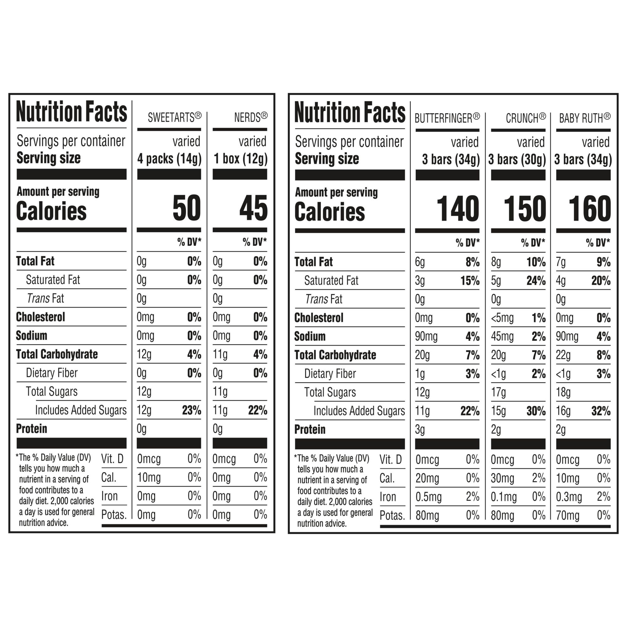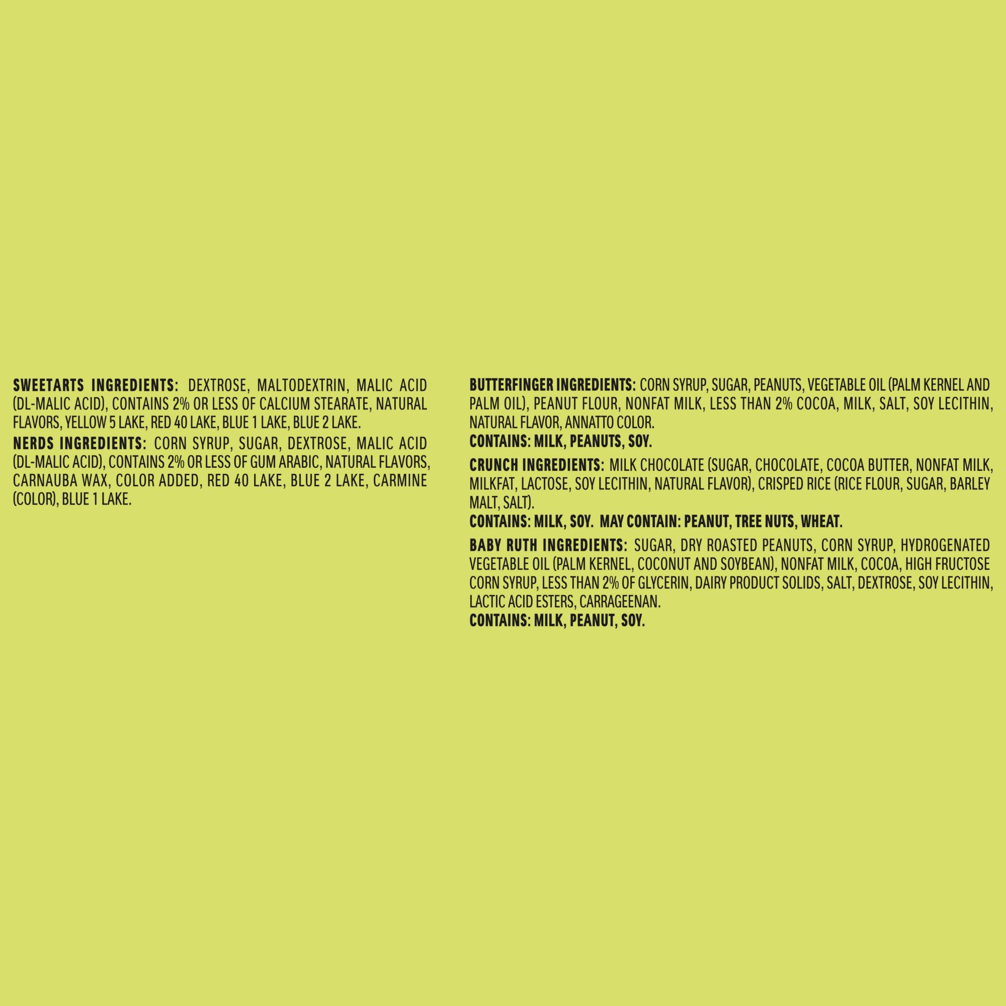 Ingredients: Baby Ruth Ingredients: Sugar, Dry Roasted Peanuts, Corn Syrup, Hydrogenated Vegetable Oil (Palm Kernel, Coconut And Soybean), Nonfat Milk, High Fructose Corn Syrup, Cocoa, Less Than 2% Of Glycerin, Dairy Product Solids, Salt, Dextrose, Soy Lecithin, Lactic Acid Esters, Carrageenan. Butterfinger Ingredients: Corn Syrup, Sugar, Peanuts, Vegetable Oil (Palm Kernel And Palm Oil), Peanut Flour, Nonfat Milk, Less Than 2% Of Cocoa, Milk, Salt, Soy Lecithin, Natural Flavor, Annatto Color. Contains Sulfites. Crunch Ingredients: Milk Chocolate (Sugar, Chocolate, Cocoa Butter, Nonfat Milk, Milkfat, Soy Lecithin, Lactose, Natural Flavor), Crisped Rice (Rice Flour, Sugar, Barley Malt, Salt, Soy Lecithin). Nerds Ingredients: Corn Syrup, Sugar, Dextrose, Malic Acid (Dl- Malic Acid), Contains 2% Or Less Of Gum Arabic, Natural Flavors, Carnauba Wax, Color Added, Red 40 Lake, Blue 2 Lake, Carmine (Color), Blue 1 Lake. Sweet Tart Ingredients: Dextrose, Maltodextrin, Malic Acid (Dl- Malic Acid), Contains 2% Or Less Of Calcium Stearate, Natural Flavors, Yellow 5 Lake, Red 40 Lake, Blue 1 Lake, Blue 2 Lake.