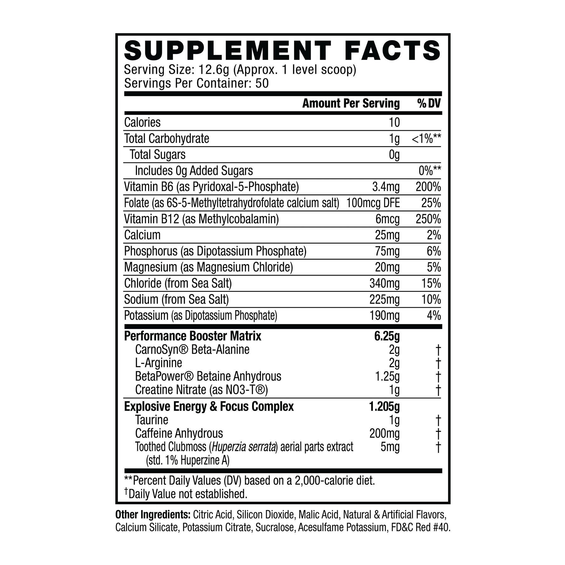 Ingredients: Citric Acid, Silicon Dioxide, Malic Acid, Natural & Artificial Flavors, Calcium Silicate, Potassium Citrate, Sucralose, Acesulfame Potassium, FD&C Red #40. 200mg Caffeine: Hard-hitting energy + focus. CarnoSyn Beta-Alanine: Clinically studied ingredient that helps support muscular endurance and combat muscular fatigue. BetaPower: Clinically studied ingredient naturally derived form of betaine, from beets, that helps maintain muscle cell hydration. Creatine Nitrate: Supports increased pump and training performance. Key Electolytes: Support hydration during intense training.