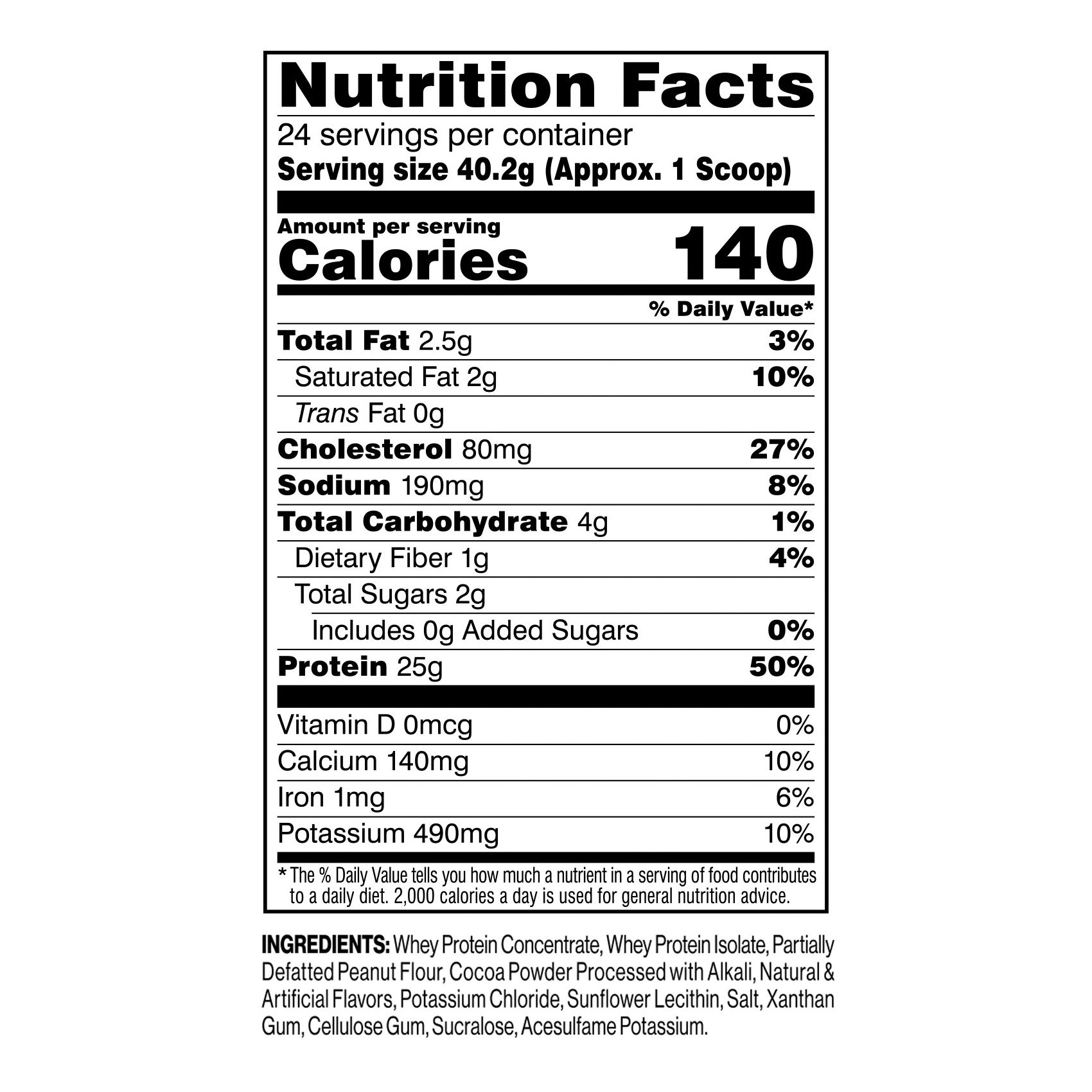 Ingredients: Whey Protein Concentrate, Whey Protein Isolate, Partially Defatted Peanut Flower, Cocoa Powder Processed with Alkali, Natural & Artificial Flavors, Potassium Chloride, Sunflower Lecithin, Salt, Xanthan Gum, Cellulose Gum, Sucralose, Acesulfame Potassium.