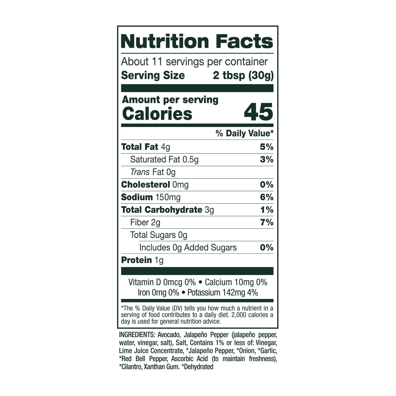 Hass Avocados from Mexico, Jalapeno Peppers, Water, Vinegar, Onion, Salt(less than 1%), Red Bell Peppers, Green Bell Peppers, Lime Juice Concentrate, Garlic, Vinegar, Xanthum Gum, Cilantro.