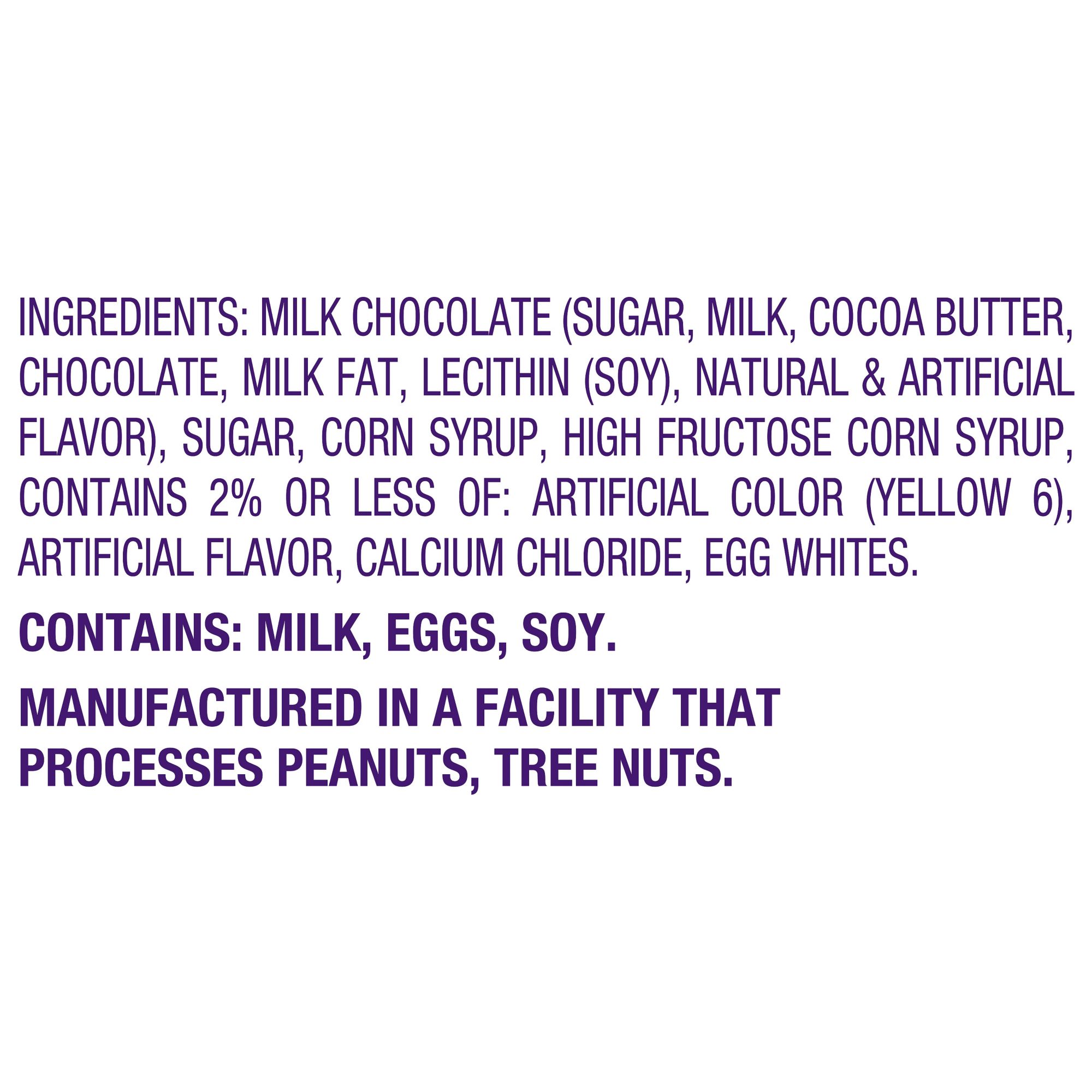 Ingredients: Milk Chocolate (Sugar, Milk, Cocoa Butter, Chocolate, Milk Fat, Lecithin (Soy), Natural &Artificial Flavor), Sugar, Corn Syrup, High Fructose Corn Syrup, Contains 2% or Less of: Artificial Colo (Yellow 6), Artificial Flavor, Calcium Chloride, Egg Whites.