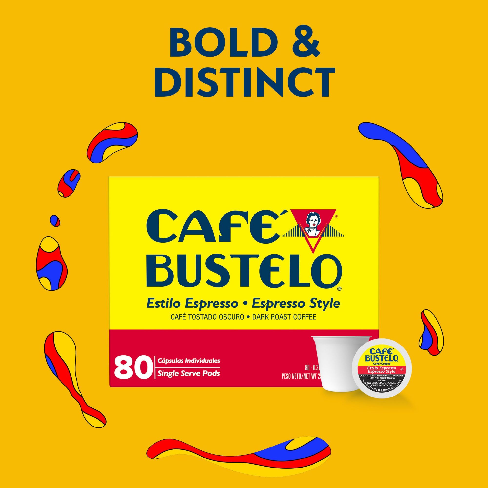Contains: 80-count box of Café Bustelo Espresso Style, dark roast, single serve coffee pods