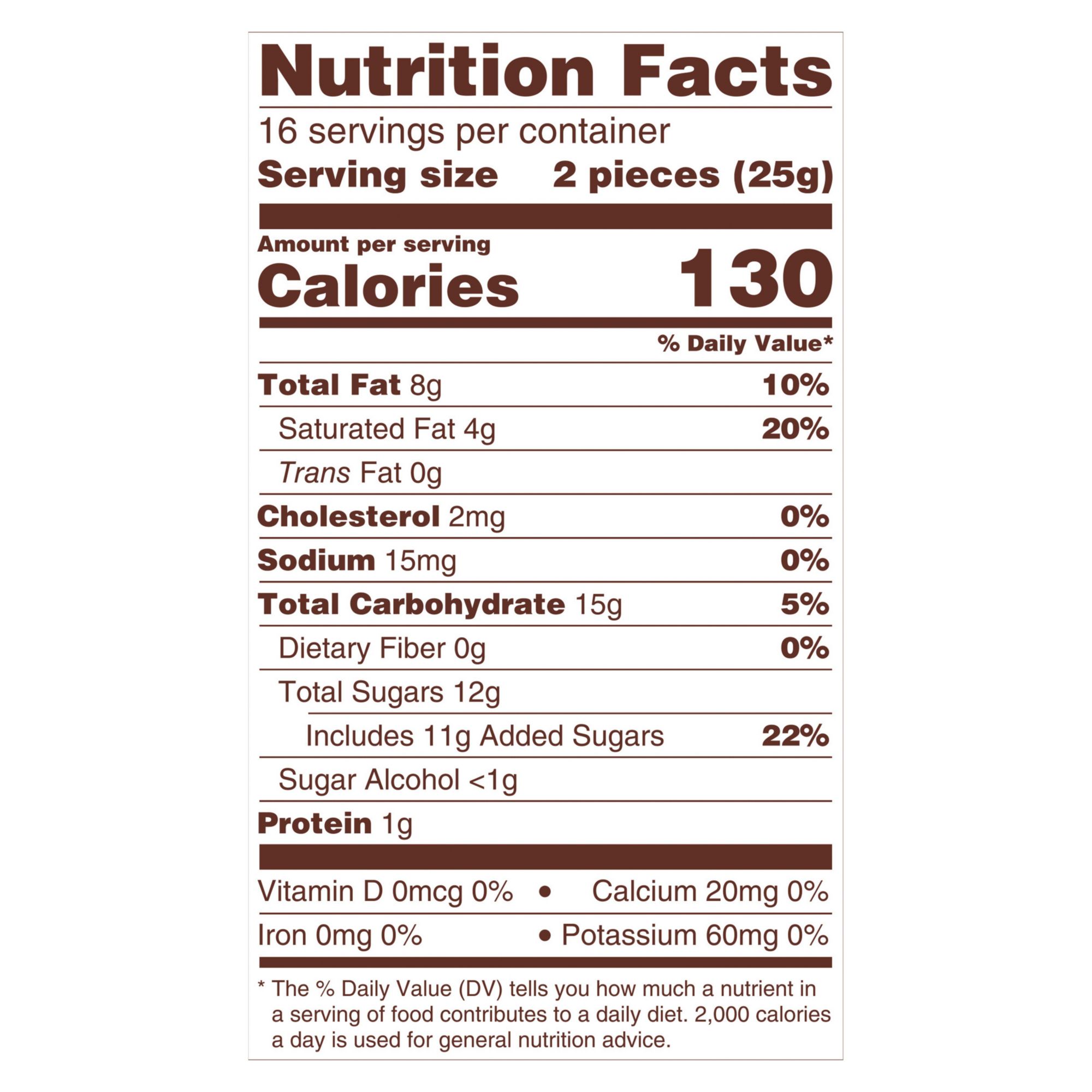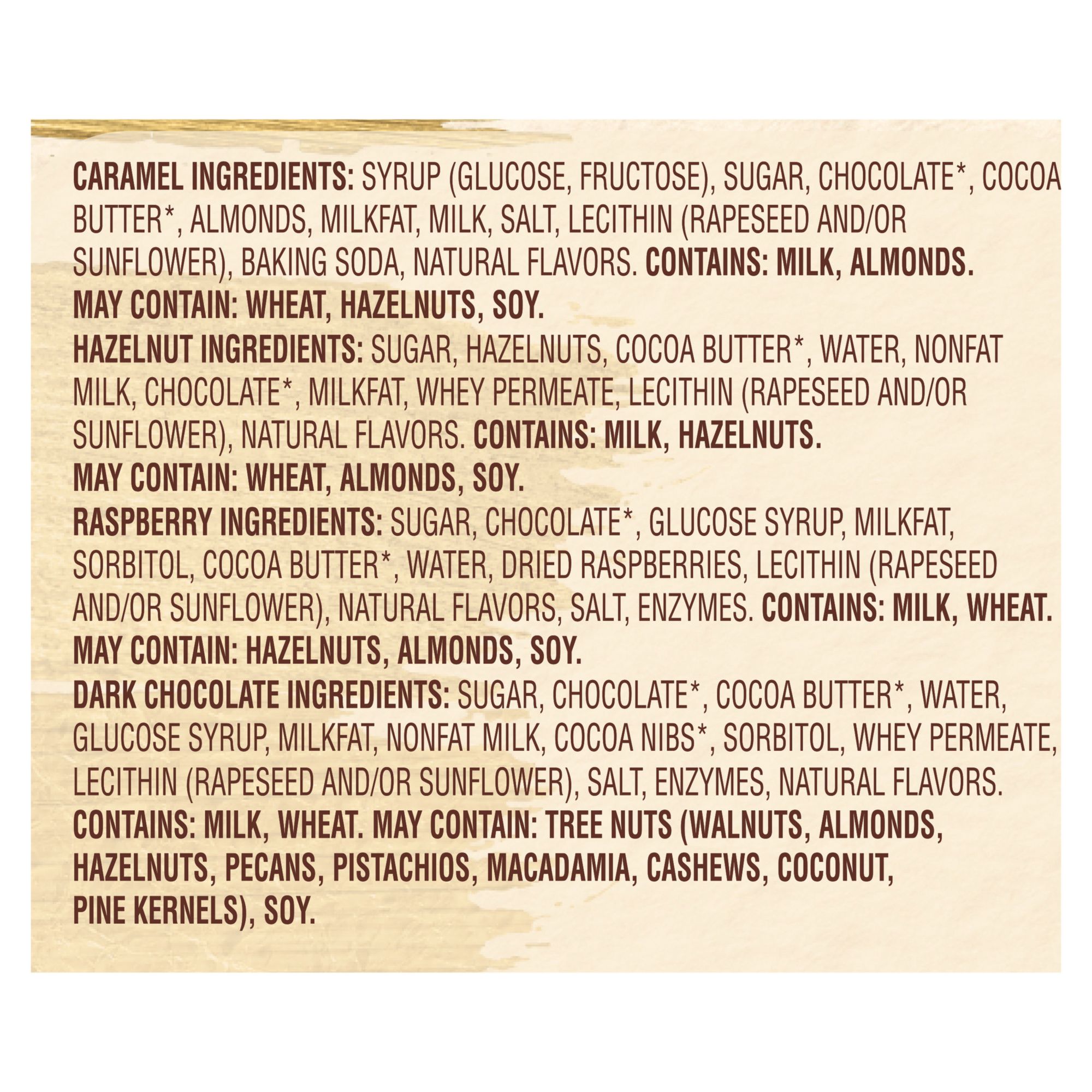 Ingredients: Caramel: Syrup (Glucose, Fructose), Sugar, Chocolate(1), Cocoa Butter(1), Almonds, Milkfat, Milk, Salt, Sunflower Lecithin, Baking Soda, Natural Flavors. Contains: Milk, Tree Nuts (almonds), Sulfites. May Contain: Wheat, Tree Nuts (hazelnuts). Hazelnut: Sugar, Hazelnuts, Cocoa Butter(1), Water, Nonfat Milk, Chocolate(1), Milkfat, Whey Permeate, Sunflower Lecithin, Natural Flavors. Contains: Milk, Tree Nuts (Hazelnuts), Sulfites. May Contain: Wheat, Tree Nuts (Almonds). Raspberry: Sugar, Chocolate(1), Glucose Syrup, Milkfat, Sorbitol, Cocoa Butter(1), Water, Dried Raspberries, Sunflower Lecithin, Natural Flavors, Salt, Enzymes, Contains: Milk, Wheat, Sulfites. May Contain: Tree Nuts (Hazelnuts, Almonds). Dark Chocolate: Sugar, Chocolate(1), Cocoa Butter(1), Water, Glucose Syrup, Milkfat, Nonfat Milk, Cocoa Nibs(1), Sorbitol, Whey Permeate, Sunflower Lecithin, Salt, Enzymes, Natural Flavors. Contains: Milk, Wheat, Sulfites. May Contain: Tree Nuts (Walnuts, Almonds, Hazelnuts, Pecans, Pistachios, Macadamia, Cashews, Coconut, Pine Kernels).