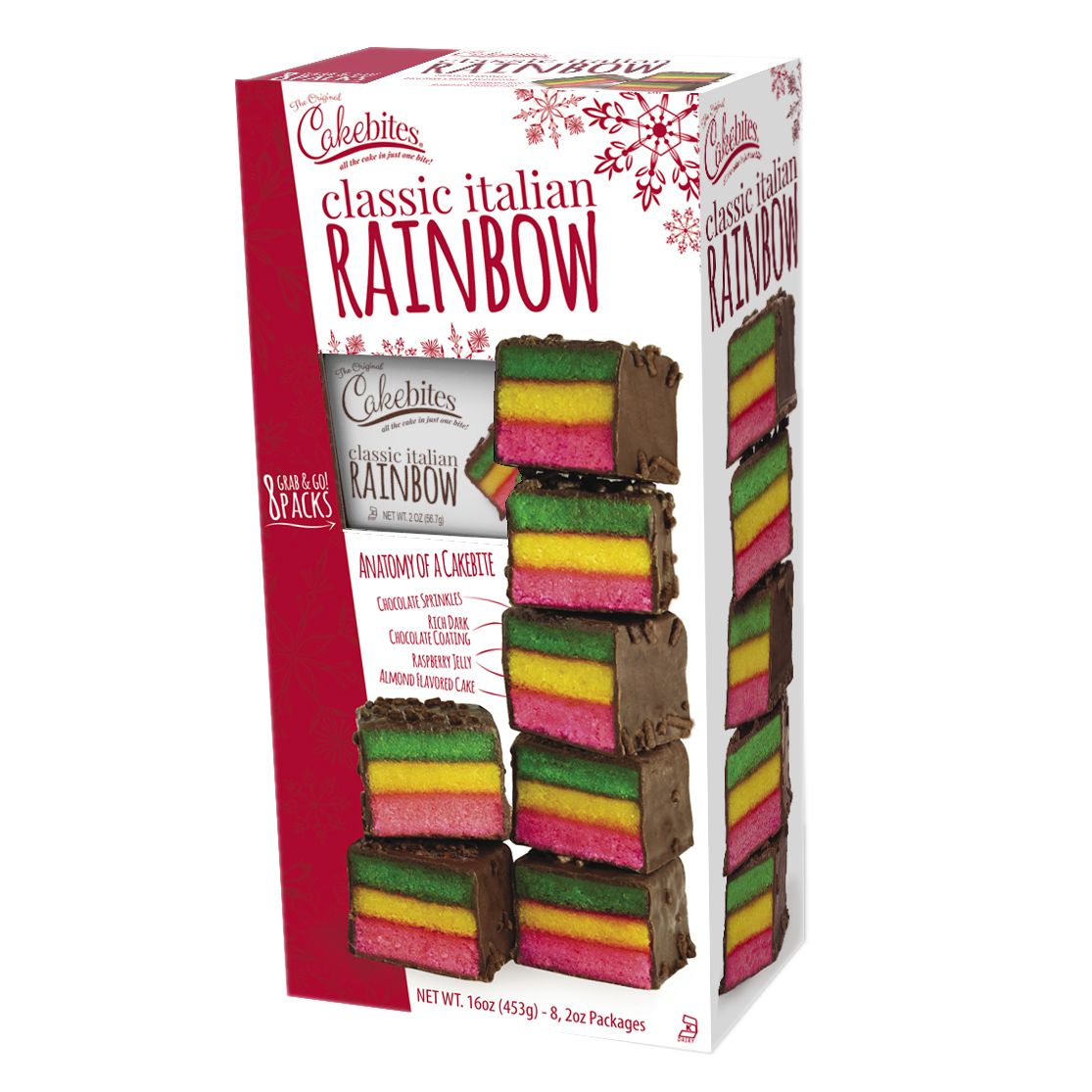 The Classic Italian Rainbow Cakes in eight convenient grab and go packs. Three colorful thin slices of velvety almond cake separated by raspberry jelly and finished in a rich dark chocolate coating.