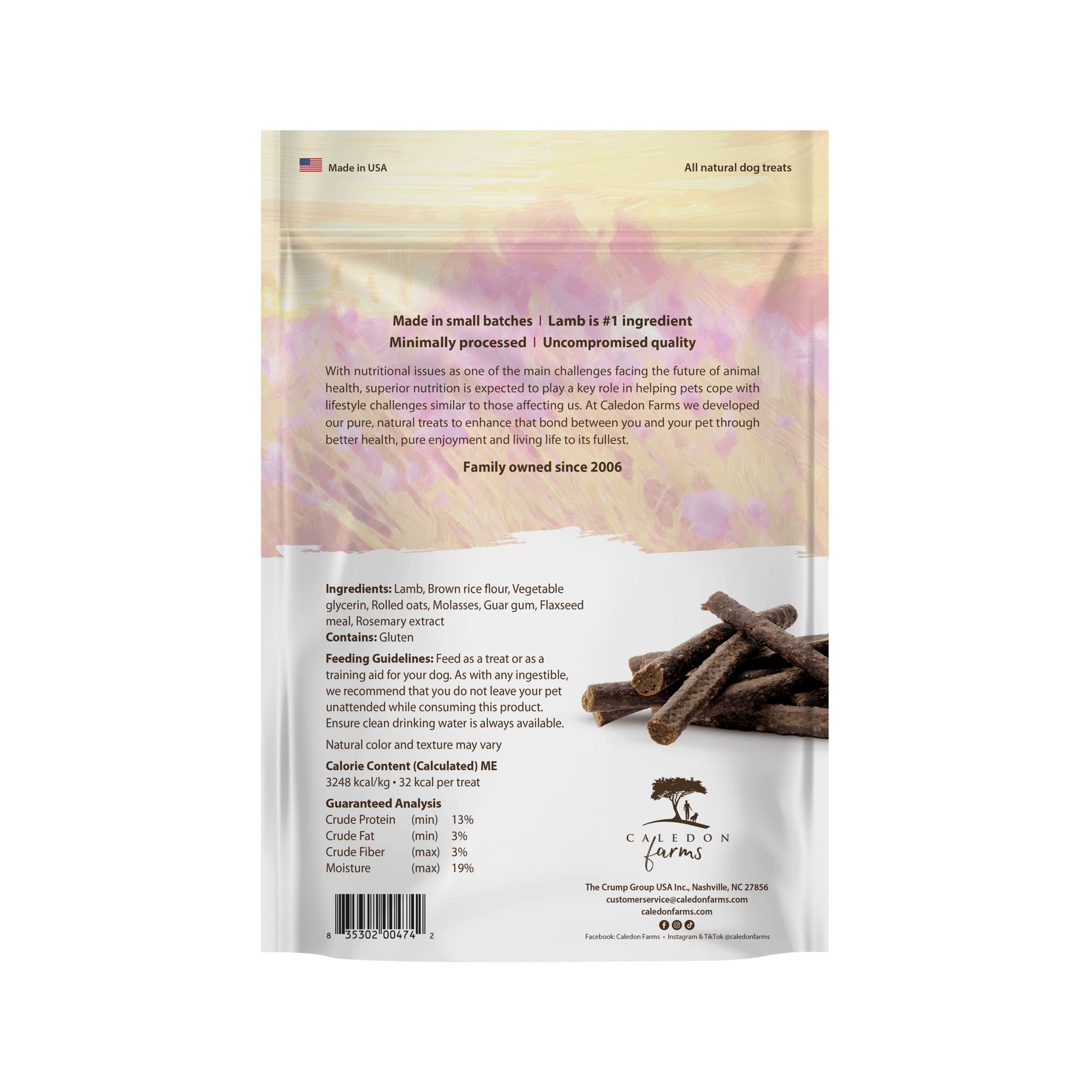 Caledon Farms Chewy Lamb Sticks are fully digestible, hypoallergenic chewy dog treats for pet parents looking for alternative proteins. These healthy dog treats are made with real lamb as the first ingredient and we delicately blend it with rolled oats, vegetable glycerin, flaxseed meal, and rosemary extract to make irresistible natural treats. These soft and chewy treats are perfect for satisfying your pup's craving for something nutritious and delicious. Plus, they're minimally processed and handcrafted in small batches to retain all of the natural goodness of our quality ingredients and ensure exceptional food safety