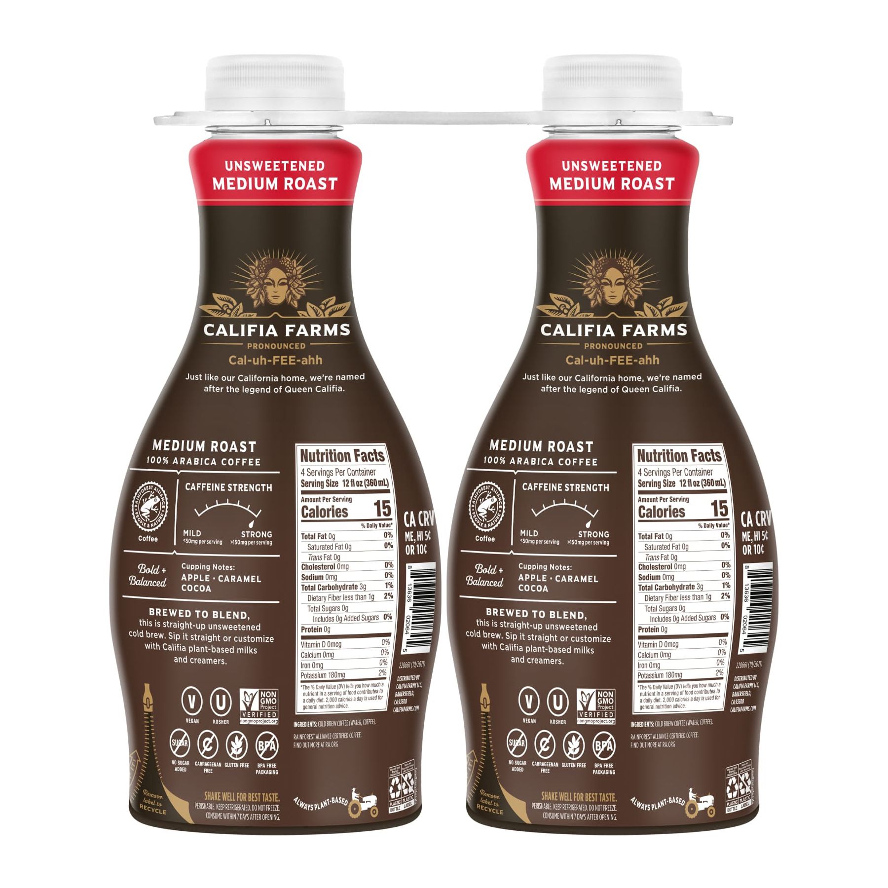 Califia Farms Pure Black Medium Cold Brew Coffee is the perfect base for creating your favorite coffee drinks at home. Sip it straight, or try blending with Califia plant-based milks and creamers! Try it hot or iced. Califia Farms cold brew coffees are gently roasted and delightfully complex, made from 100% arabica beans for a balanced (not bitter) cup of coffee. Califia Farms is committed to continuously finding ways to improve manufacturing practices, contributing to a better world for people and nature. That's why all Califia Farms coffee is purchased from Rainforest Alliance Certified farms. Pure Black Medium Roast Cold Brew is unsweetened so you can customize to your personal taste or sip it straight, hot or iced.