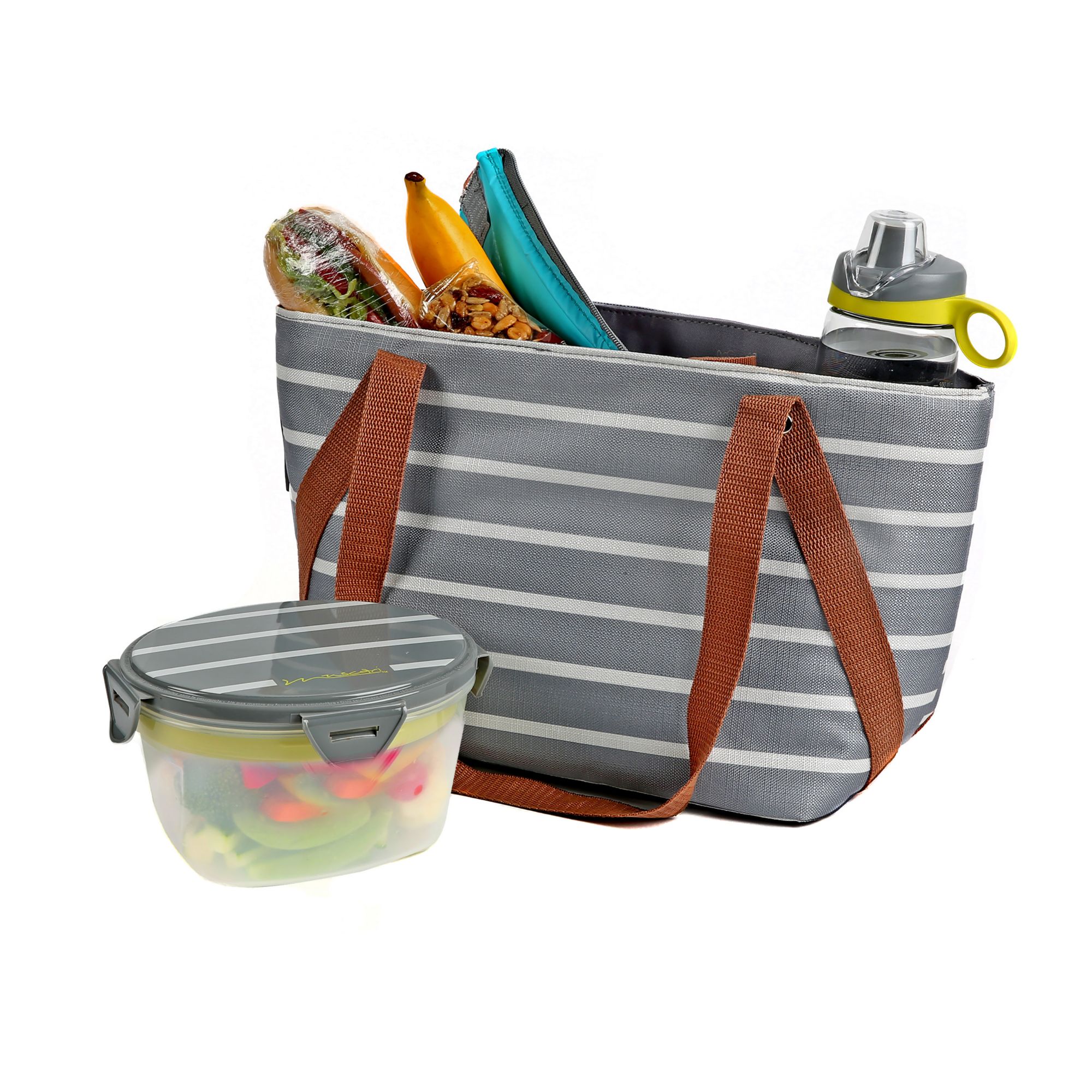High density thermal insulation Easy clean leak-proof lining with Microban antimicrobial protection Insulated leak-proof drink/accessory compartment 500mL Tritan bottle Leak-proof 5-piece food container Shoulder strap Choose from assorted colors Includes tote, 5-piece food container and 500mL Tritan bottle Warranty: lifetime limited