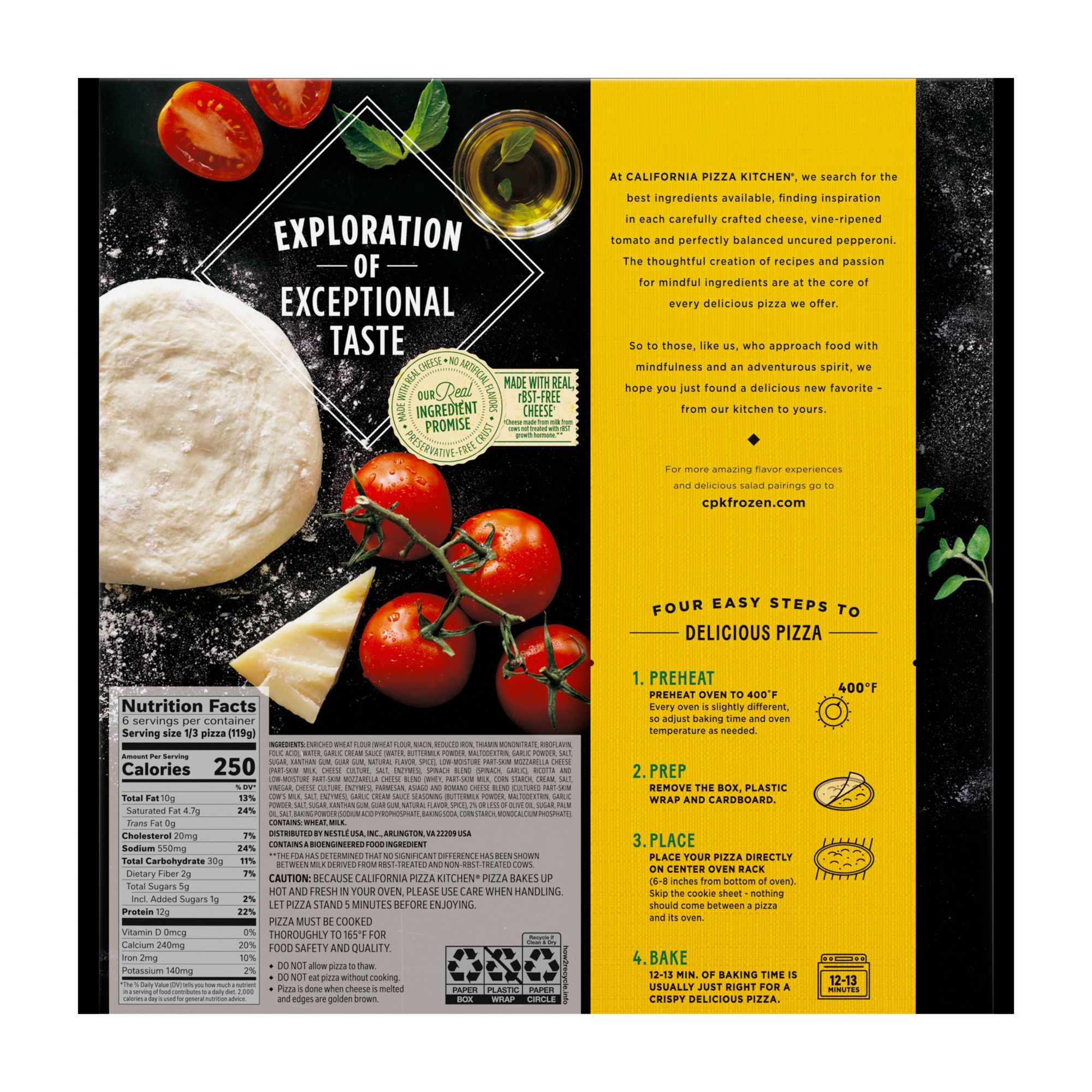 At California Pizza Kitchen, they search for the best ingredients available, finding inspiration in each carefully crafted cheese, vine-ripened tomato and perfectly balanced uncured pepperoni. The thoughtful creation of recipes and passion for mindful ingredients are at the core of every delicious pizza they offer. So to those, like California Pizza Kitchen, who approach food with mindfulness and an adventurous spirit, they hope you just found a delicious new favorite – from their kitchen to yours. For more amazing flavor experiences and delicious salad pairings go to cpkfrozen.com. California Pizza Kitchen's real ingredient promise: no artificial flavors, preservative-free crust with cheese, made with real, rbst-free cheese† †Cheese made from milk from cows not treated with rBST growth hormone.** **The FDA has determined that no significant difference has been shown between milk derived from rBST-treated and non-rBST-treated cows.